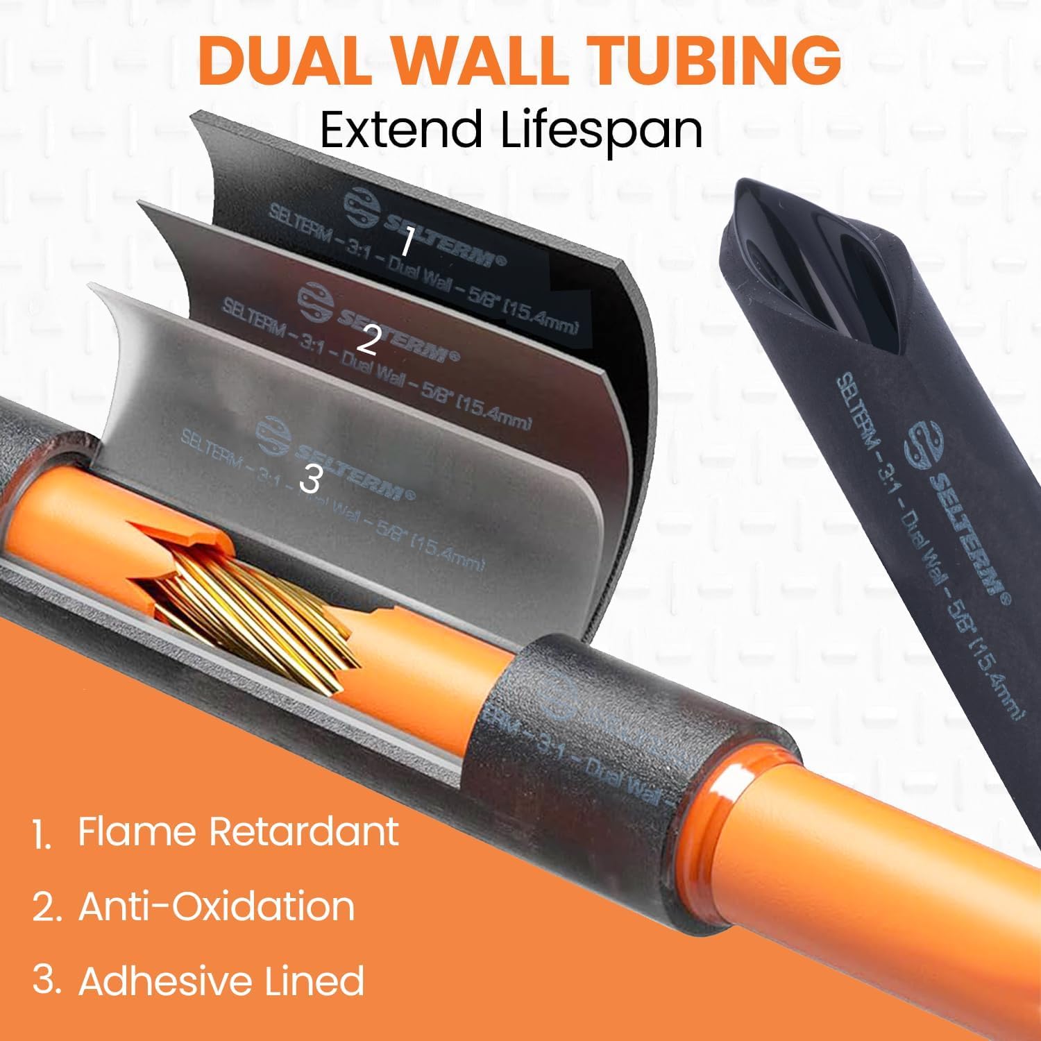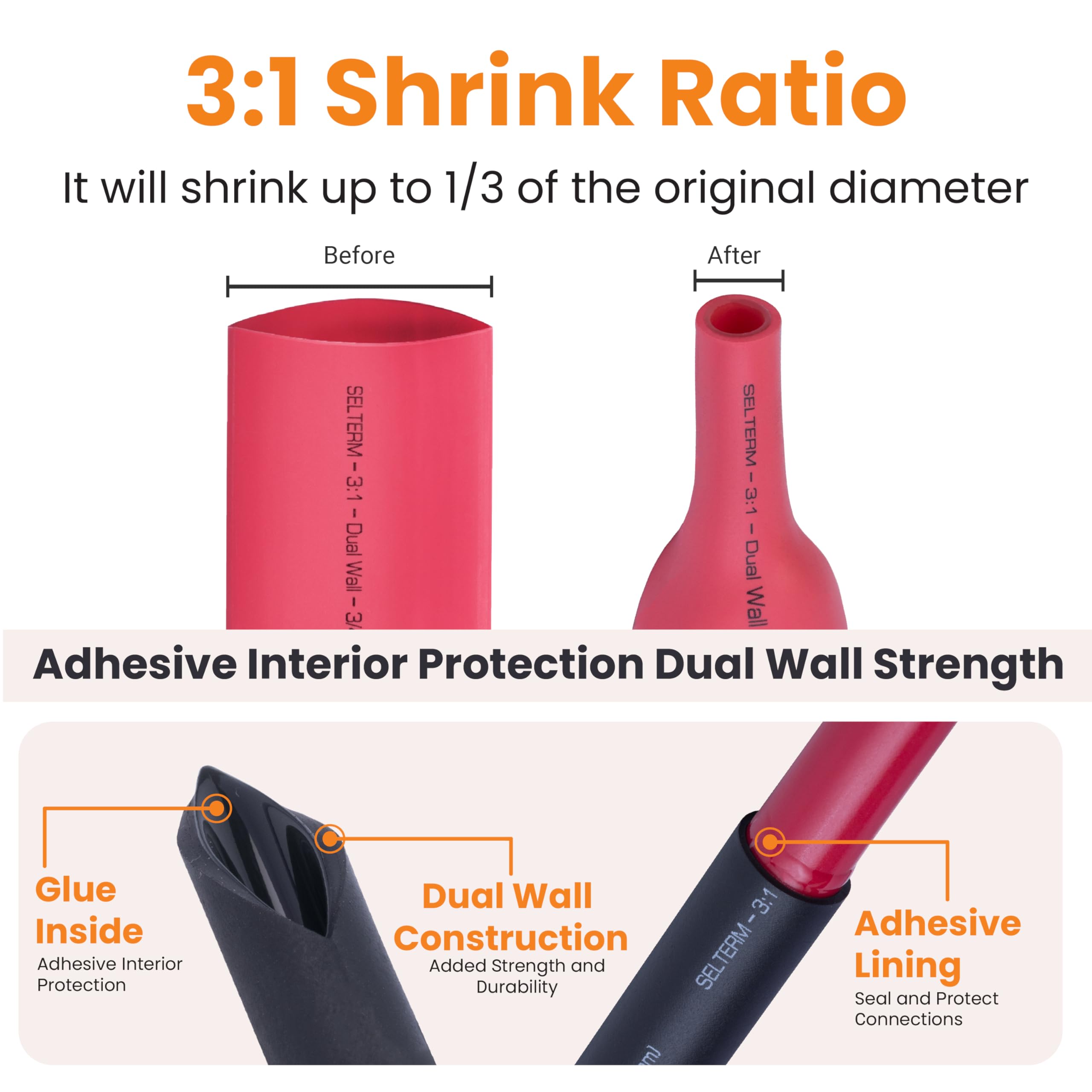 Heat-Resistant Durability: The Selterm copper wire lugs kit comes with 12pcs 3:1 black & red heat shrink tubing with adhesive. This tubing offers excellent insulation, protecting connections from heat, moisture, and corrosion, thus extending the life of your battery setup.