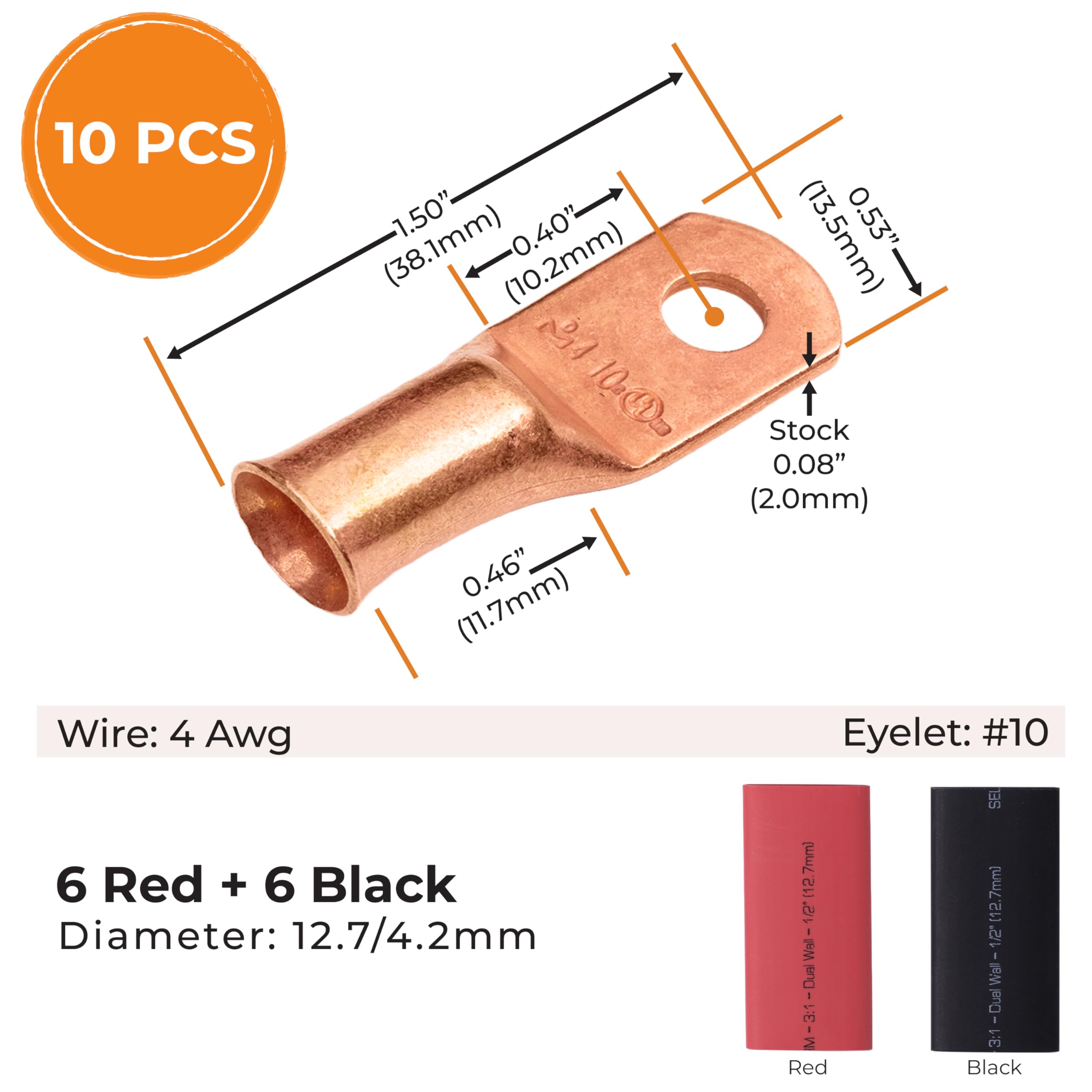 Package Contains: Each purchase includes 10pcs 4 AWG - #10 stud battery lugs ring terminal connectors, along with 12pcs 3:1 black & red heat shrink tubing with adhesive. This comprehensive kit provides all the essentials for maintaining efficient and lasting battery connections.