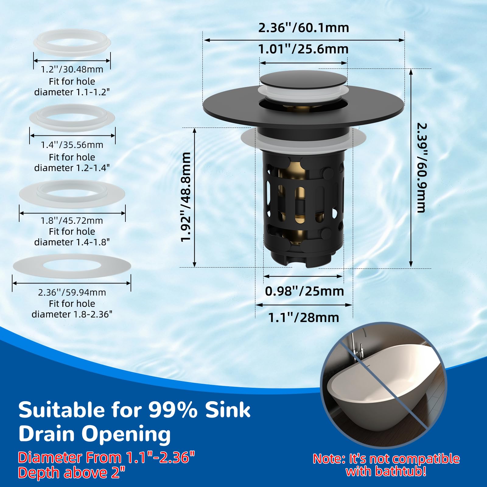 [Versatile Compatibility & Easy Installation] This bathroom sink drain stopper includes four O-rings, which are designed to fit 99% of standard US sink drains, including bathroom sinks and washbasins with drain holes measuring between 1.1" and 2.36". Please measure the sink drain hole diameter before purchasing it for a proper fit. The installation is quick and hassle-free, without the need for expensive tools or plumber fees. Simply remove your old stopper and insert the new one into the drain hole, installation only takes a few seconds