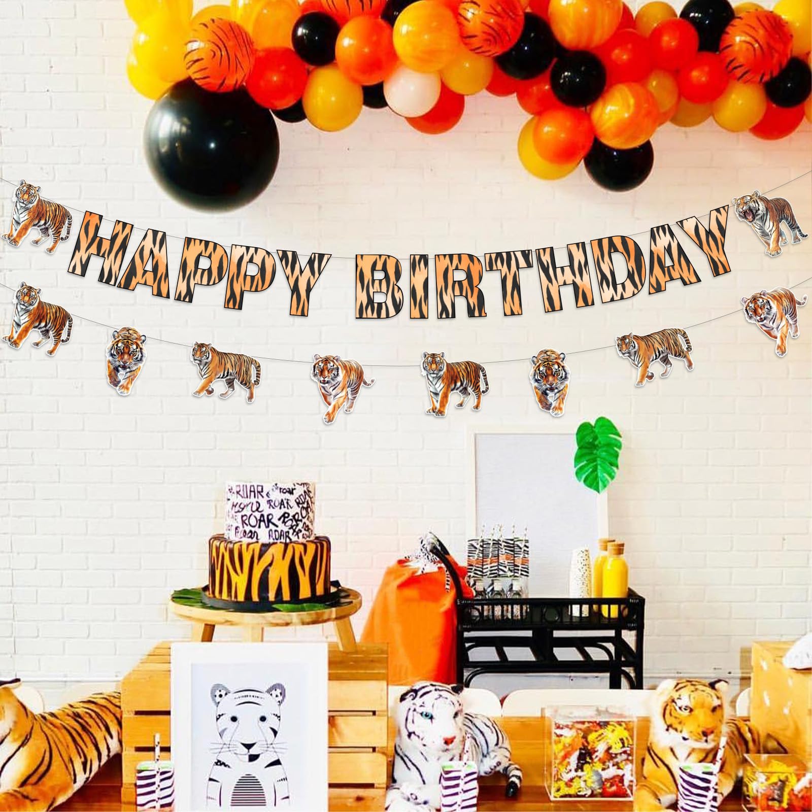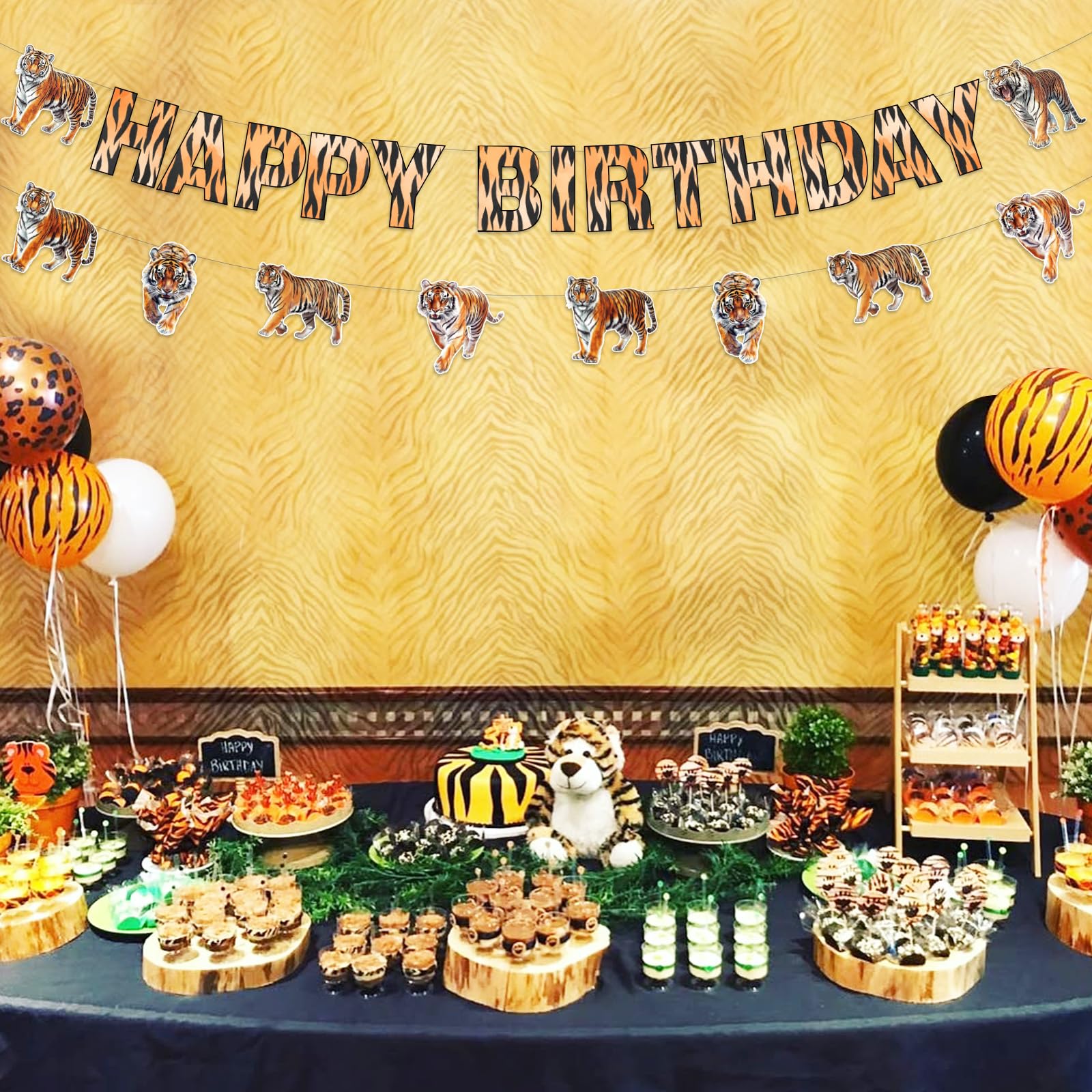 Tiger happy birthday banner decorations: The eye-catching Happy Birthday banner features striking tiger prints that instantly create a festive jungle atmosphere. Complementing cheetah and leopard print garlands add depth and variety to your party space, suitable for walls, tables, or ceiling displays