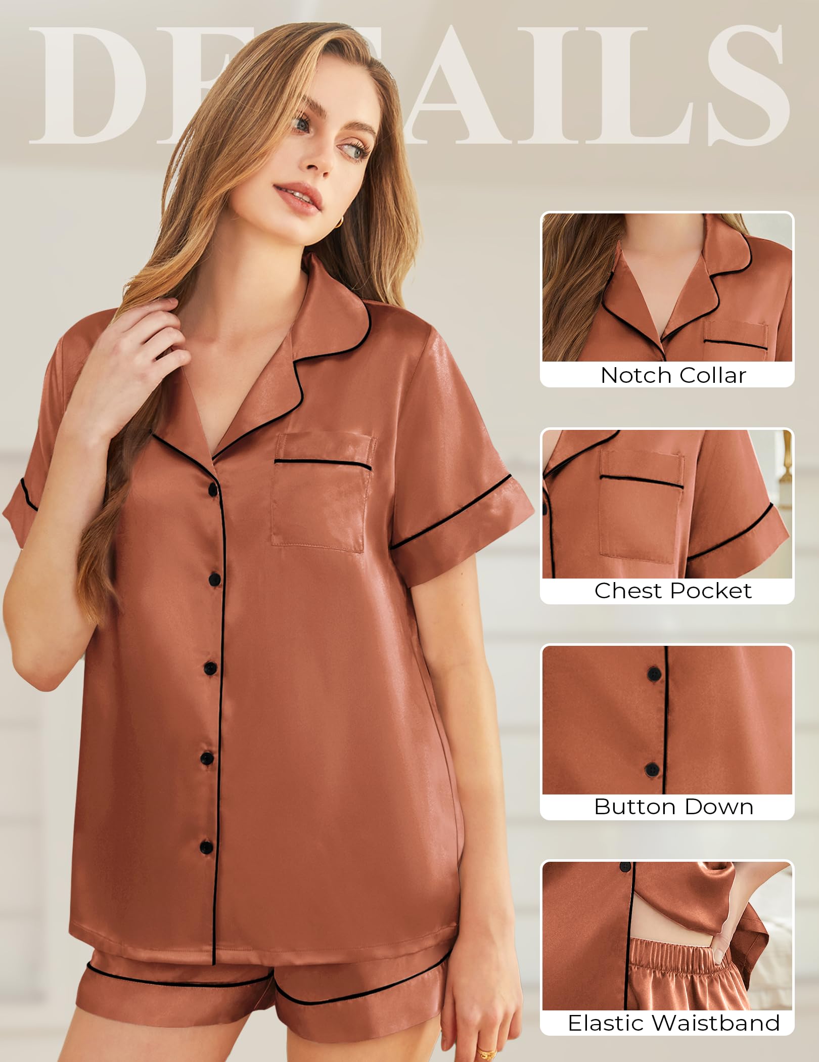 Material: Shefoty satin pajama set is made of premium 95% Polyester and 5% Spandex, soft, lightweight and breathable. Its skin-friendly silky fabric offers you ultimate comfort for casual wear and nighttime sleep.
