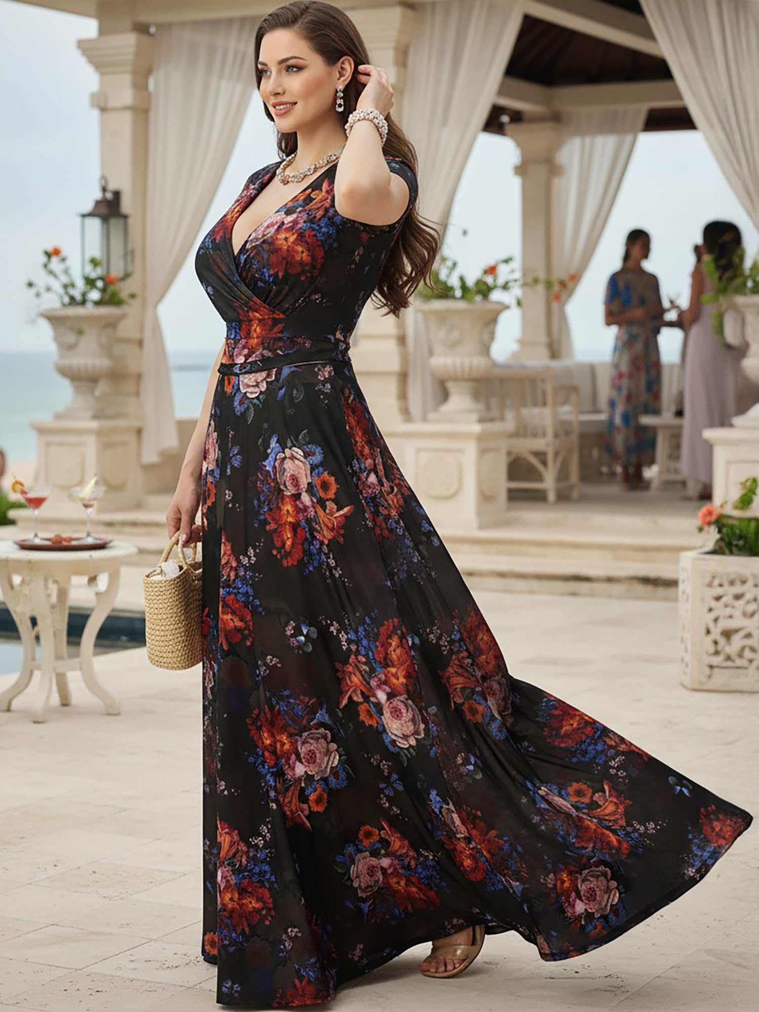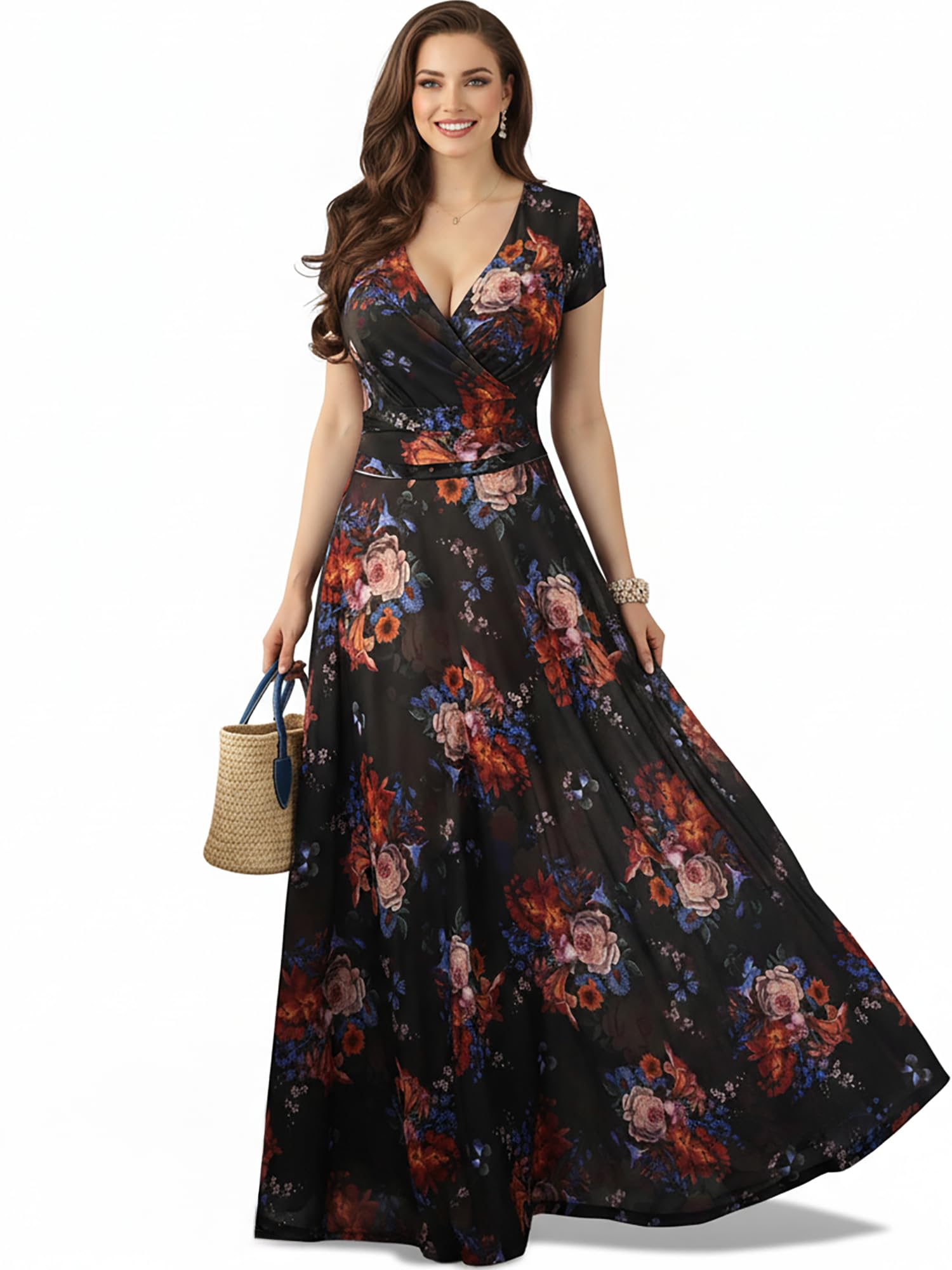 Plus sized flattering Black and Multi maxi dress; full figure slimming clothing; comfy big size dress; ladies short sleeved maxi dress; sexy curvaceous elegant womans clothes; loose fitting comfortable clothing; large sizing gowns with sleeves