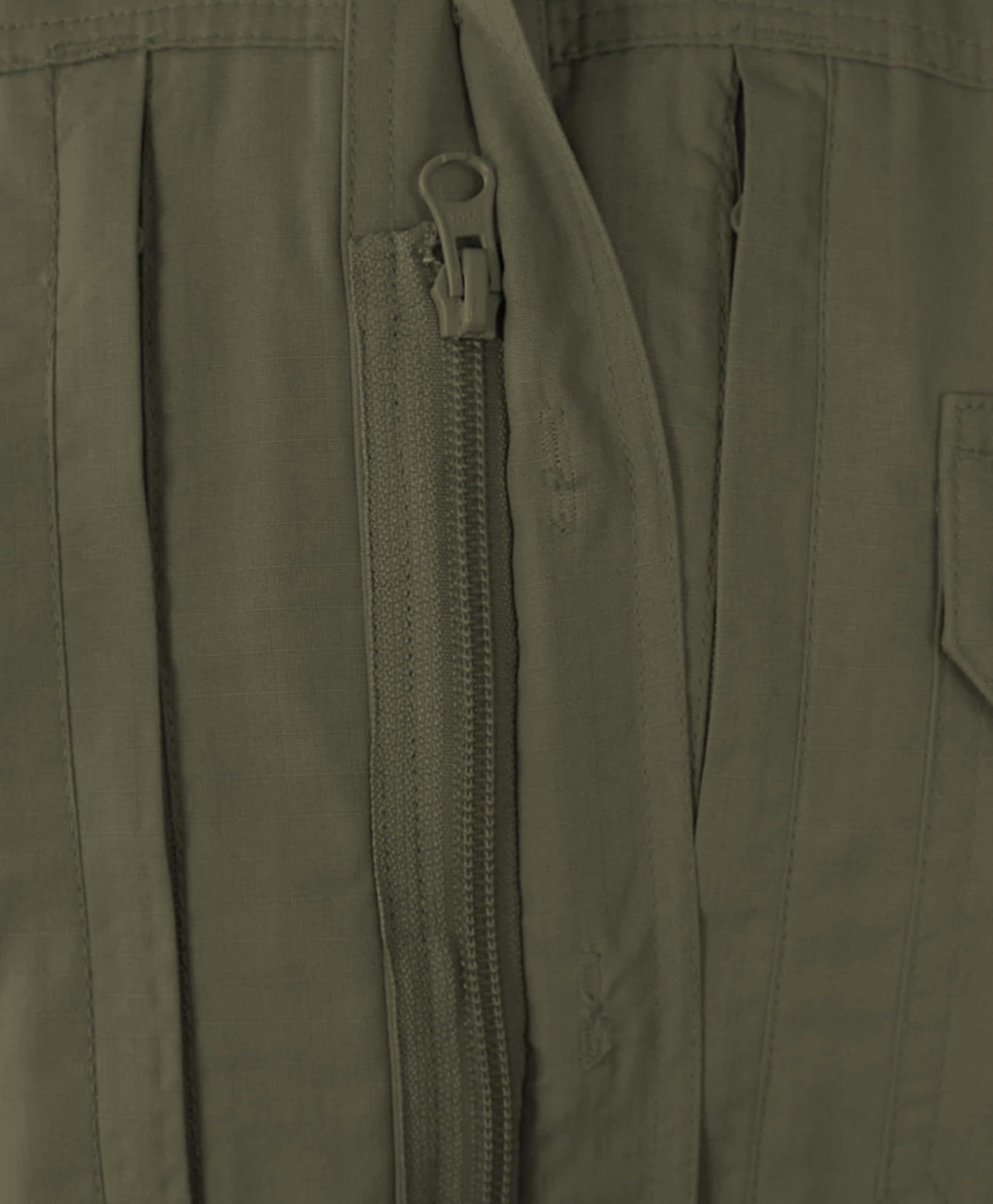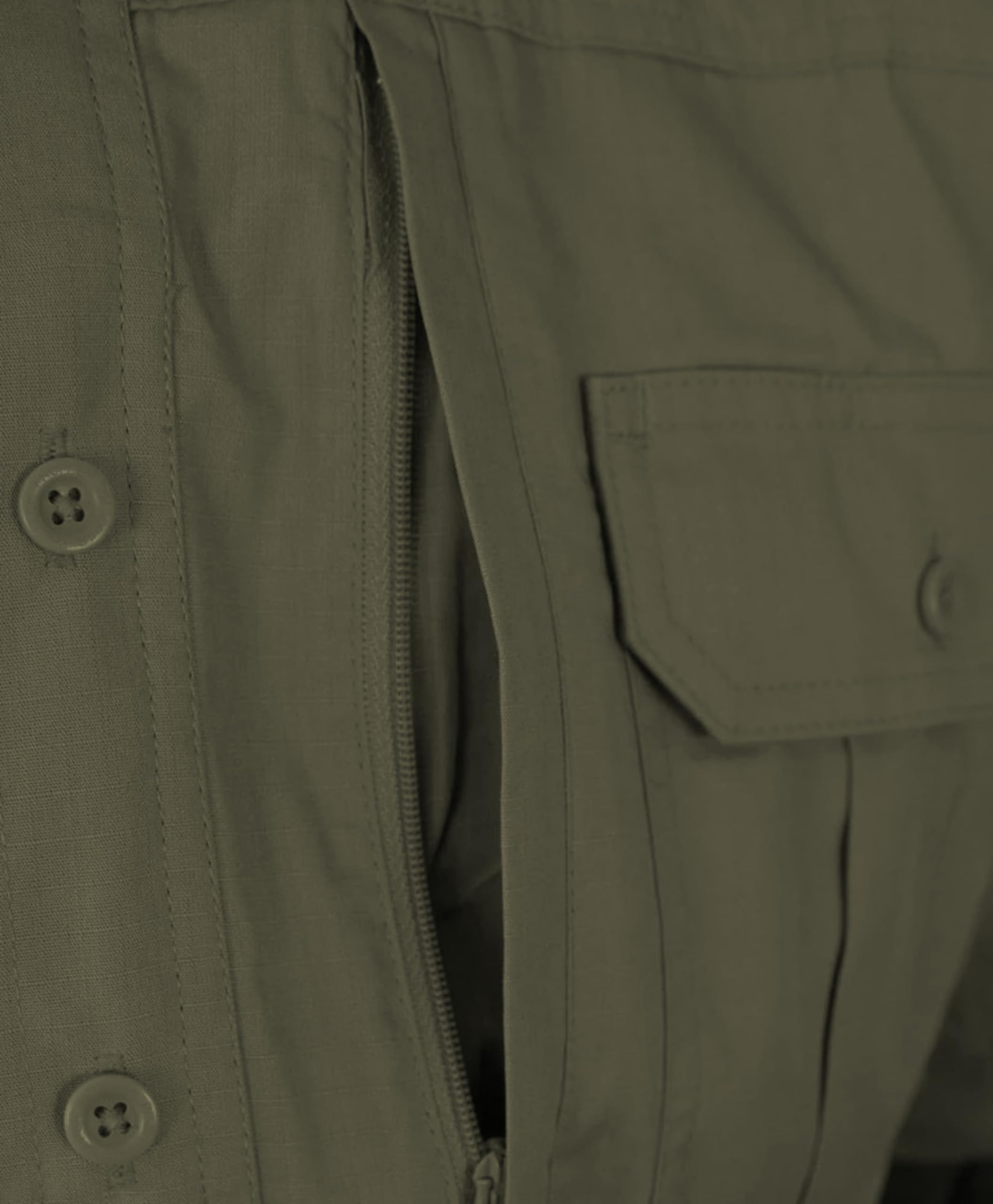 Two box-pleated chest pockets with hook and loop closure