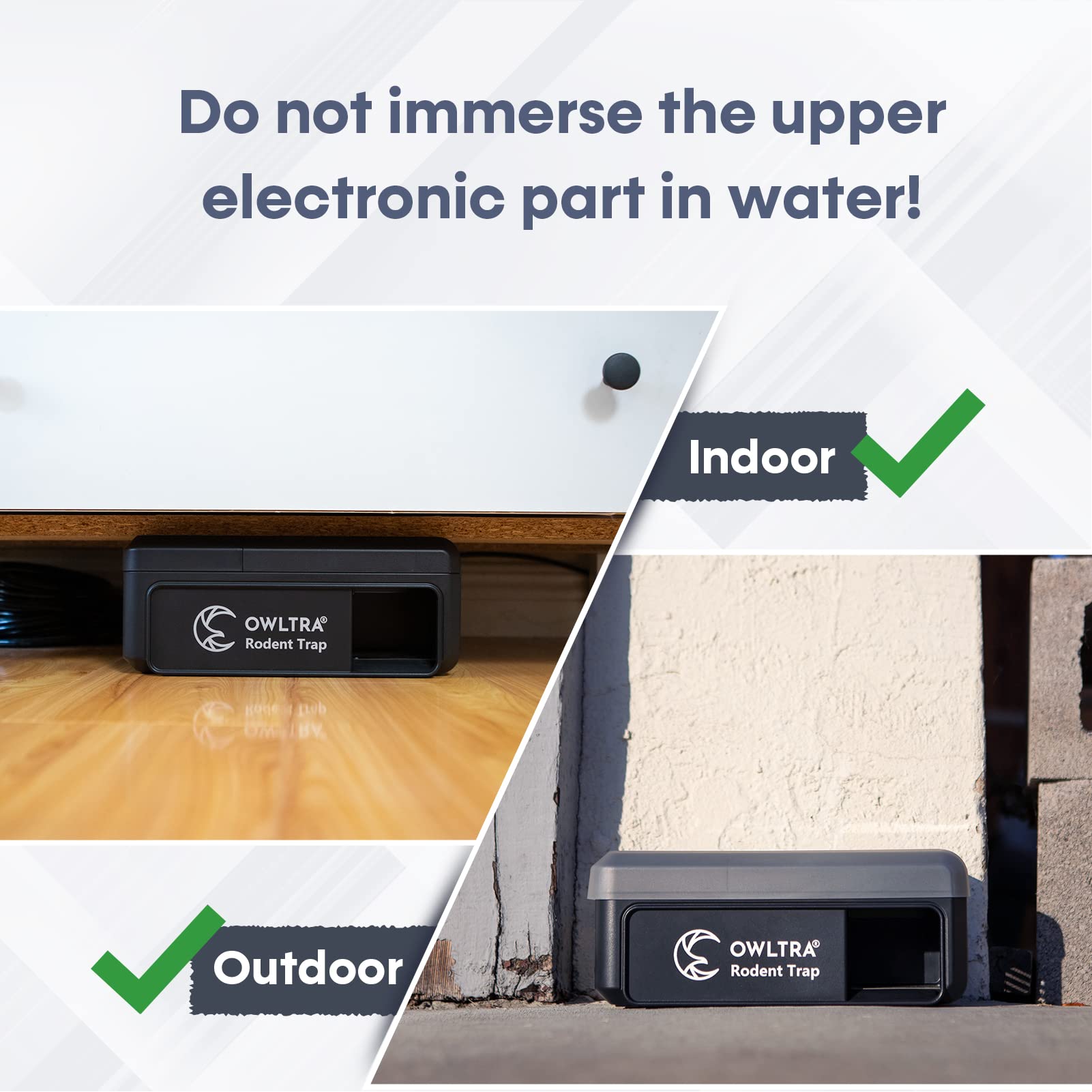 Outdoor Usage with Waterproof Grade IPX4 - OWLTRA OW-7 In-/Outdoor Electric Rodent Trap can be used outdoors when using together with the waterproof cover that comes with the product. Rodent entrance at the side ensures zero rodent escape and a quick elimination. CAUTION: The product MUST be used together with semi-transparent waterproof cover when being used outside. Place the trap on a clean dry surface and do not immerse the product in water.