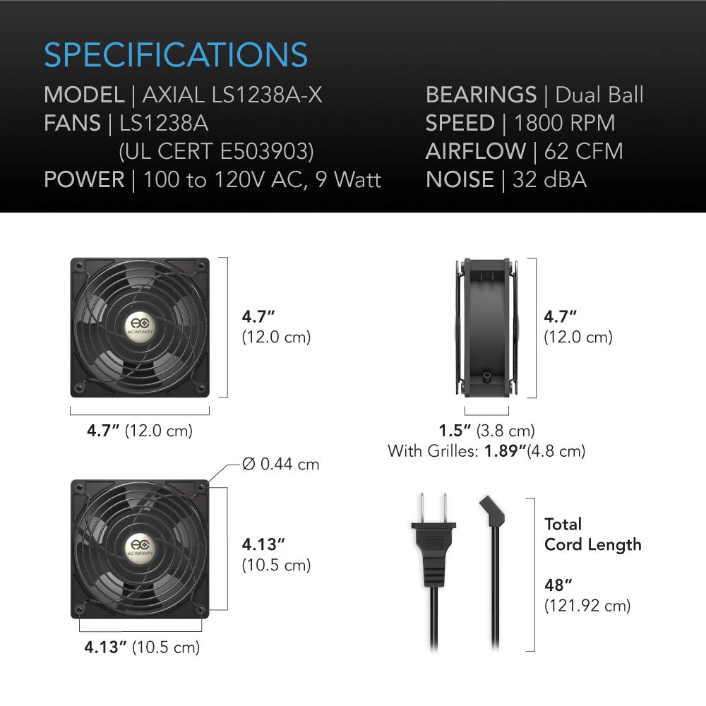120 x 120 x 38 mm (4.7 x 4.7 x 1.5 in.) | 100 to 120V AC | Airflow: 62 CFM | Noise: 32 dBA | Speed: 1800 RPM