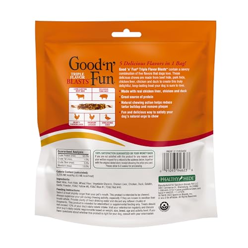 Good ‘n’ Fun chews offer a tasty variety of flavors that dogs love. These delicious chews are made from the finest ingredients, including beef hide, pork hide and real chicken, to create truly delightful, long-lasting treats your dog will love. Good ‘n’ Fun Triple Flavor Blasts contain a savory combination of five flavors that dogs love. These delicious chews are made from beef hide, pork hide, chicken liver, chicken and duck to create this truly delightful, long-lasting treat your dog will love. Wrapped with premium cuts of real chicken, these chews are a great source of protein for dogs of all sizes. Good ‘n’ Fun Triple Flavor Blasts are a fun and delicious way to satisfy your dog’s natural urge to chew, while the natural chewing action helps reduce tartar buildup and remove plaque. Select a treat slightly larger than your pet’s mouth. This product is intended to be chewed. Always supervise your pet during chewing activity, especially if they are known to swallow their treats whole. Provide plenty of fresh drinking water and discard any leftover chunks or fragments. This product is intended for intermittent or supplemental feeding only. Treats should not exceed 10% of your dog’s daily caloric intake. Visit your veterinarian regularly and discuss your pup’s daily caloric requirements based on weight, size, breed, age and activity level. If you have questions about whether this product is right for your dog, consult with your veterinarian.