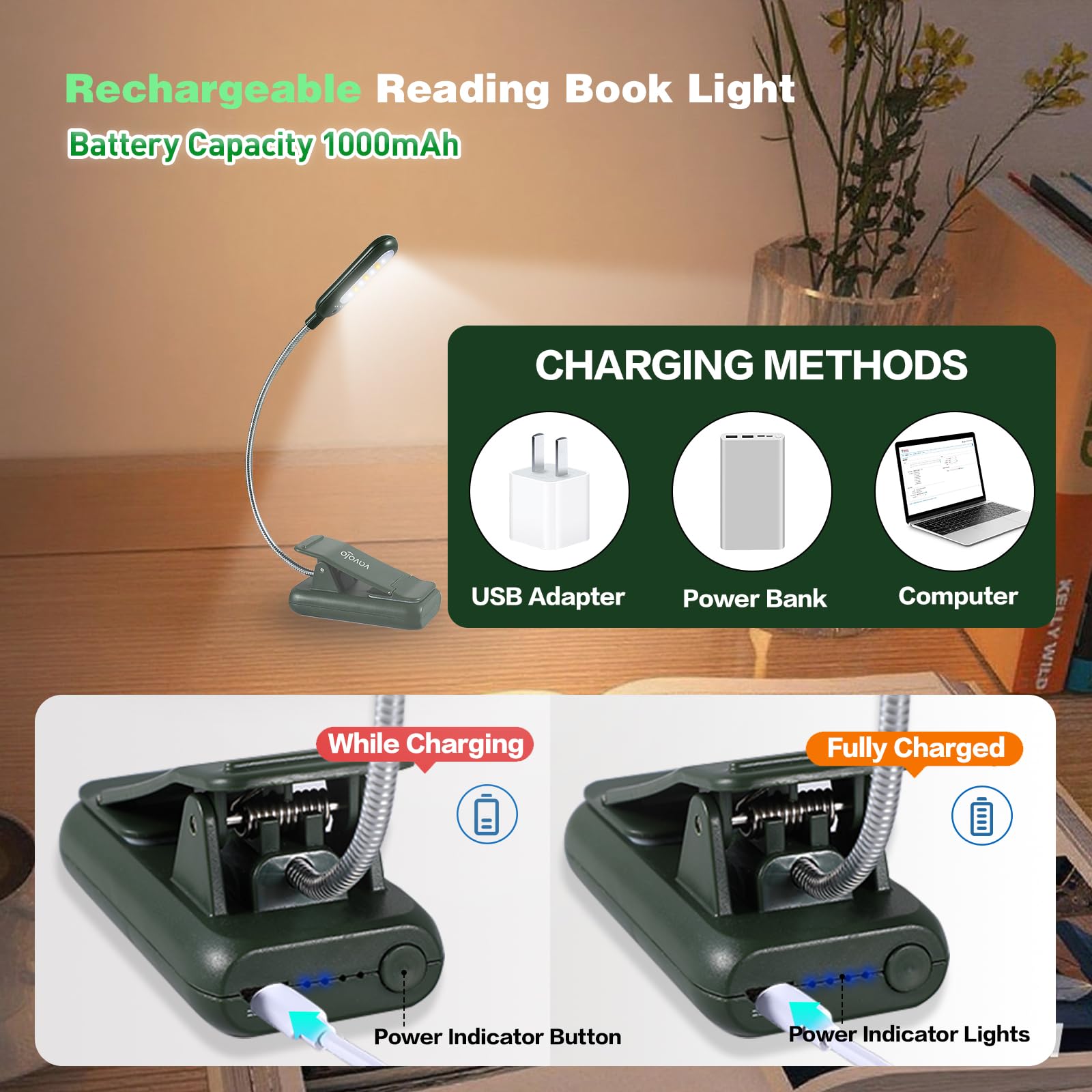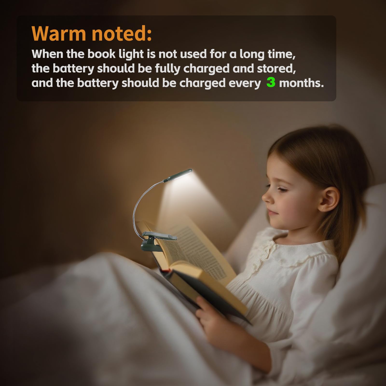 【Rechargeable & Long-lasting Lighting】 The battery life is great. Usb rechargeable with a built-in battery that can last up to 25 hours of use(LOW Mode). At High Mode, the reading light can last up to 5 hours lighting time. No need to buy batteries any more, save money. The correctly charging book light will make your reading light more durable. Please charge the book light every 3 months. When book lights are not used for a long time, the reading lights should be fully charged before stored.
