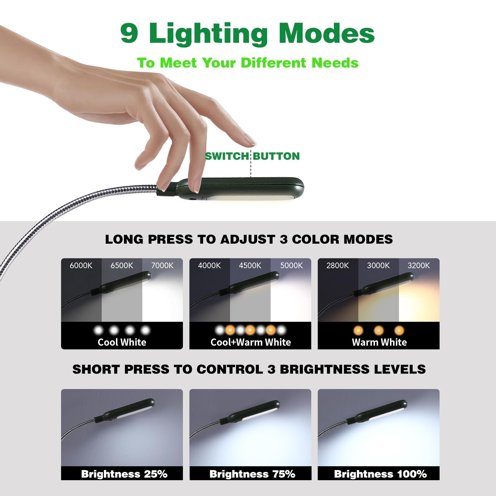 【9 Brightness Modes to Choose】9 color temperatures x 3 brightness settings(Low, Medium, High ), You can adjust 9 different kinds of brightness levels dimmable by one button which is on the reading light. You can choose your favorite comfortable setting according to your demands, such as reading, working, studying, sewing, camping, or sleeping etc. VAVOFO's book light can be as the flashlight or the night light. Awesome light weight rechargeable reading book light