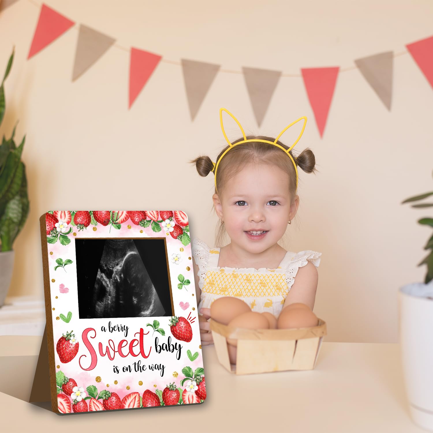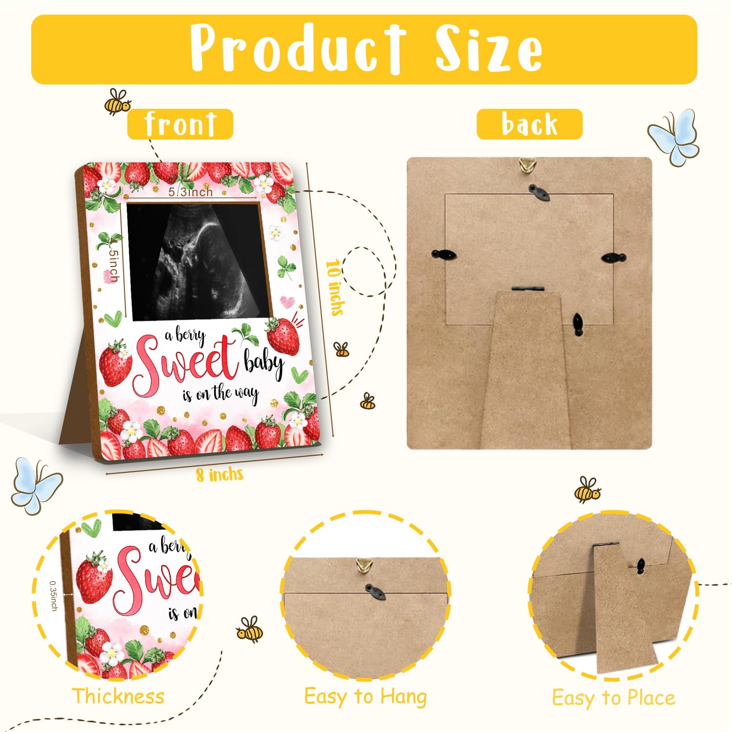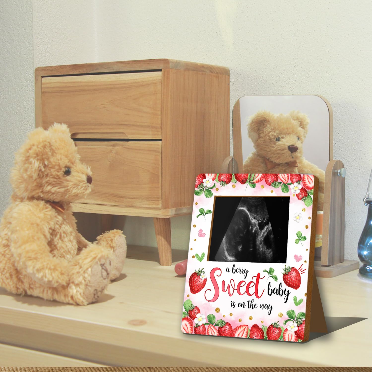 Material: This strawberry baby ultrasound photo frame for expectant parents, has clear printing and is made of wood material. It is sturdy and not easily damaged and can be used by you for a long time.