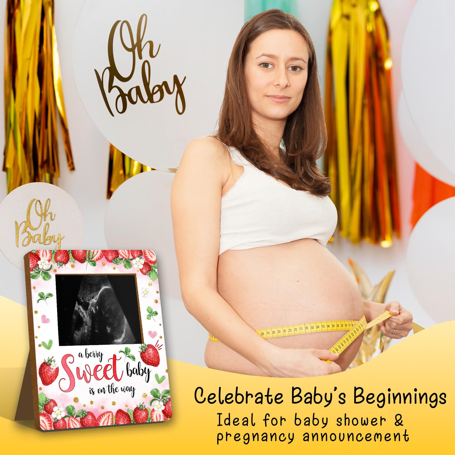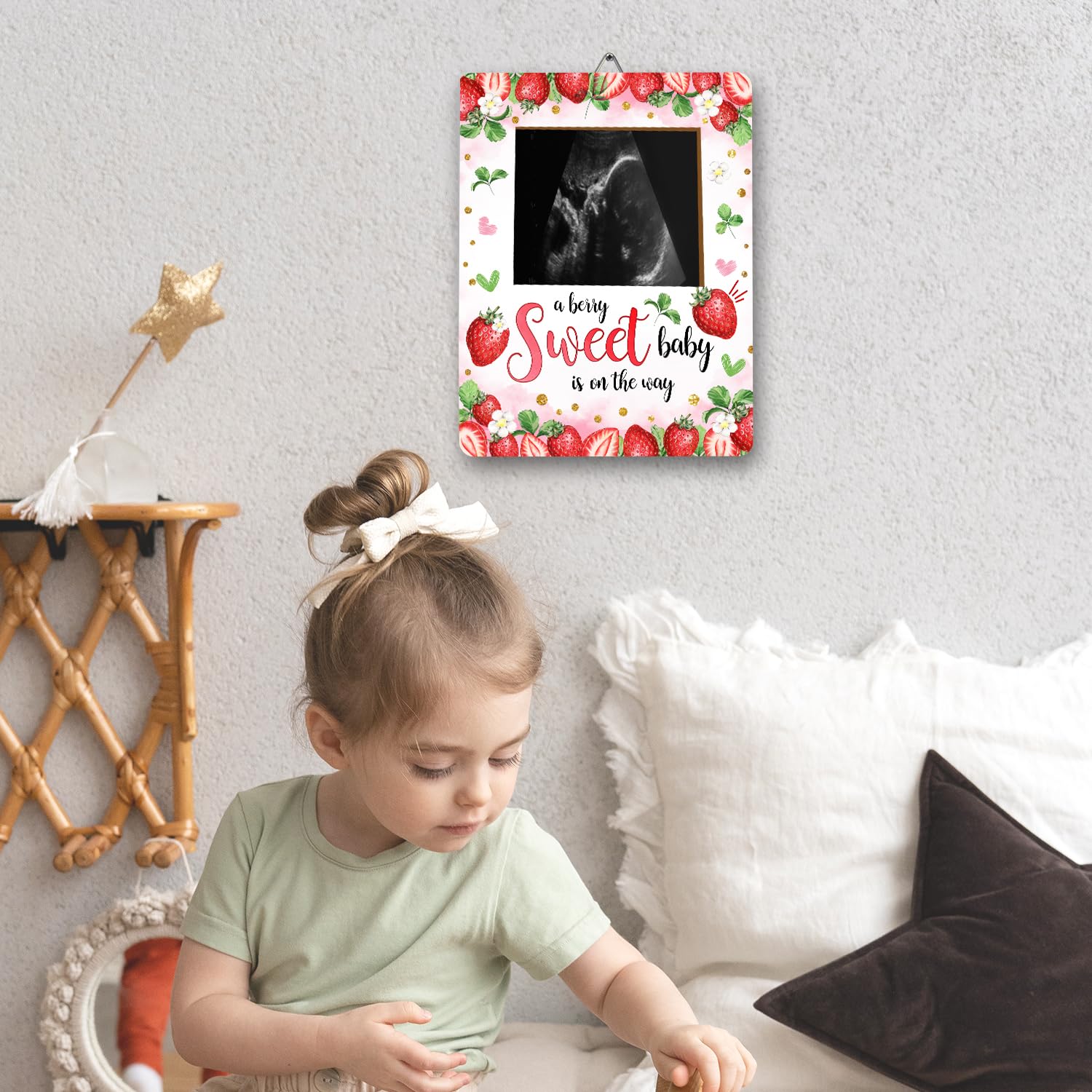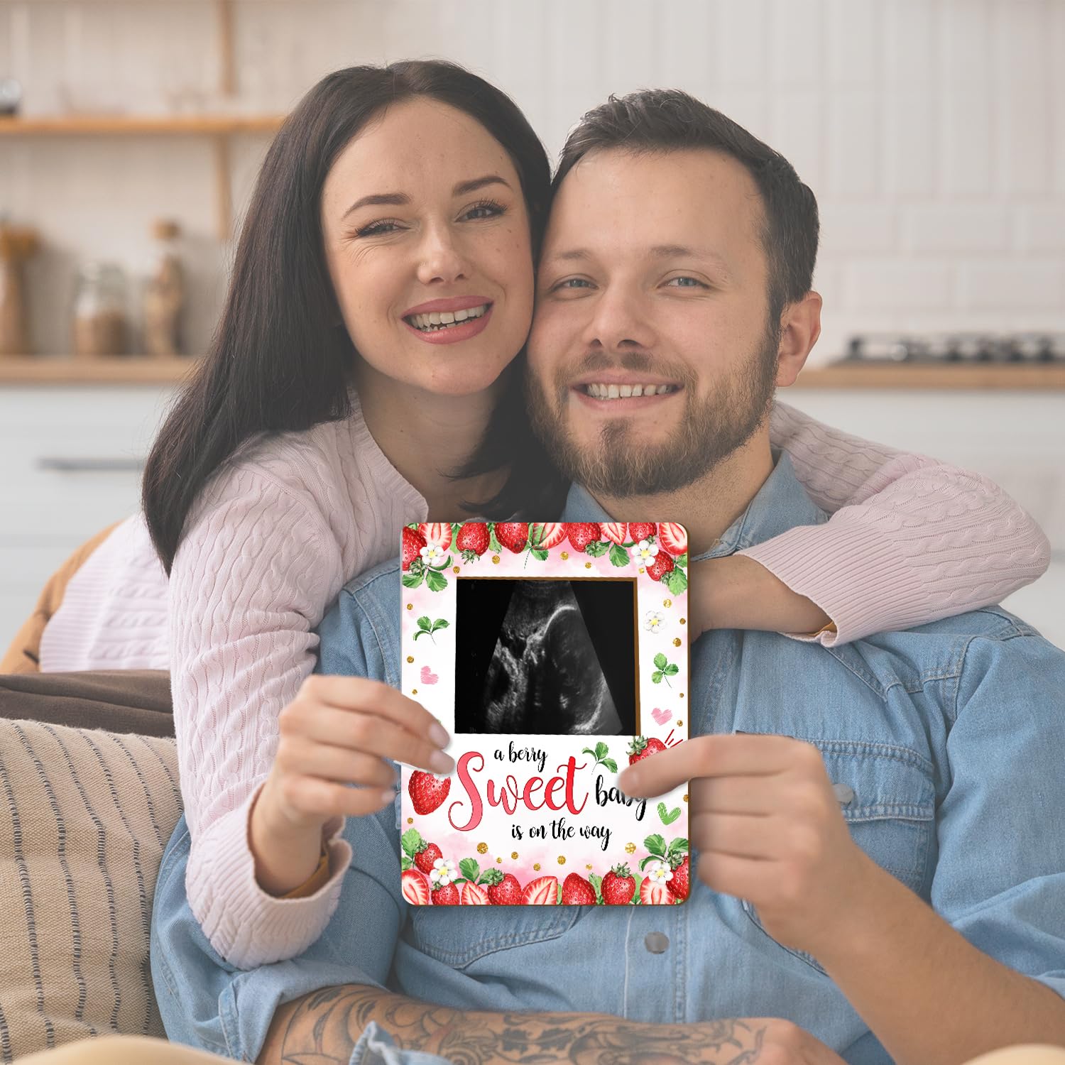 Material: This strawberry baby ultrasound photo frame for expectant parents, has clear printing and is made of wood material. It is sturdy and not easily damaged and can be used by you for a long time.