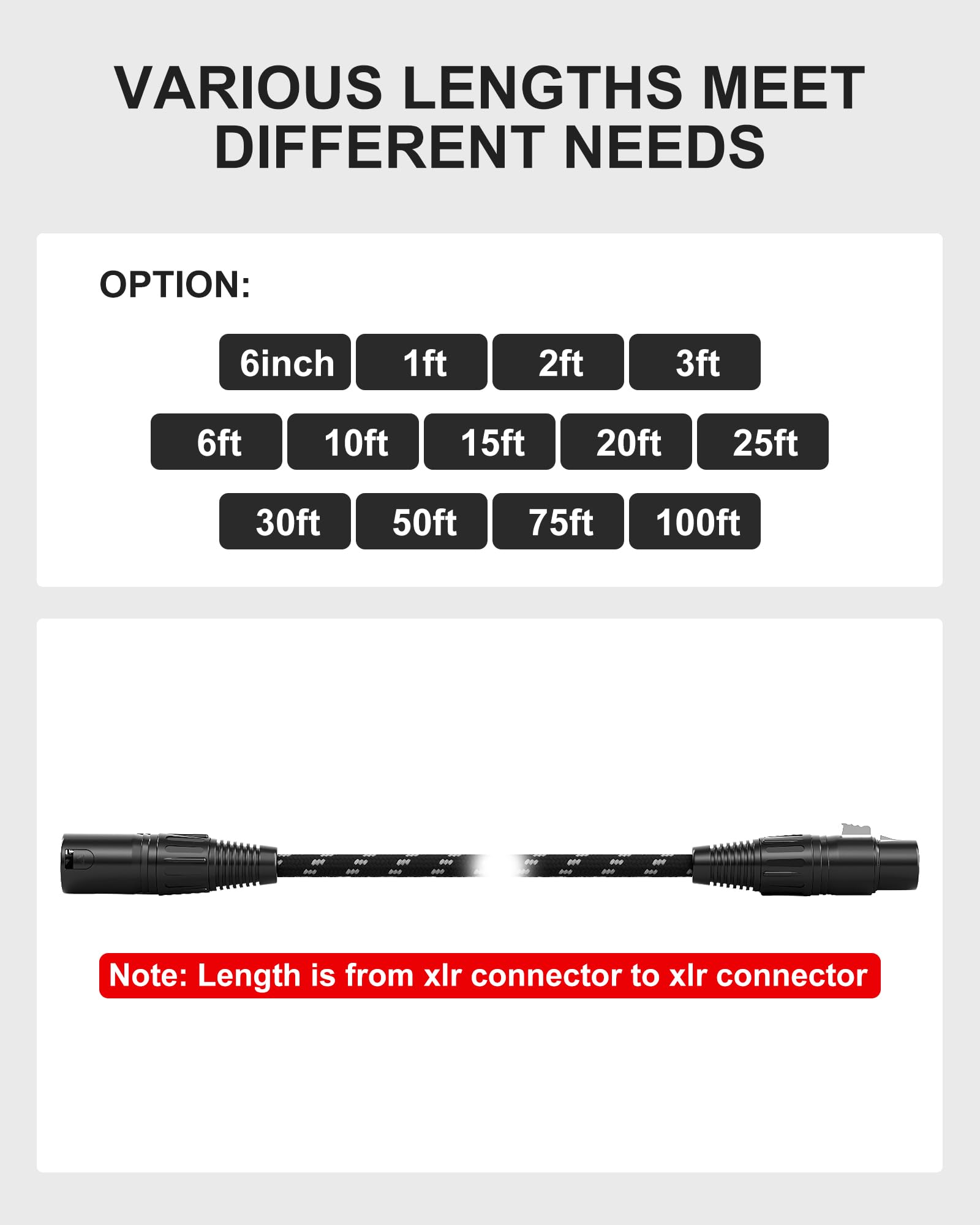 【Multiple Length Options】Please note that xlr cables mic cord length is measured from XLR connector to XLR connector, length option: 6inch ,1ft, 2ft, 3ft, 6ft, 10ft, 15ft, 20ft, 25ft, 30ft, 35ft, 50ft, 75ft, 100ft