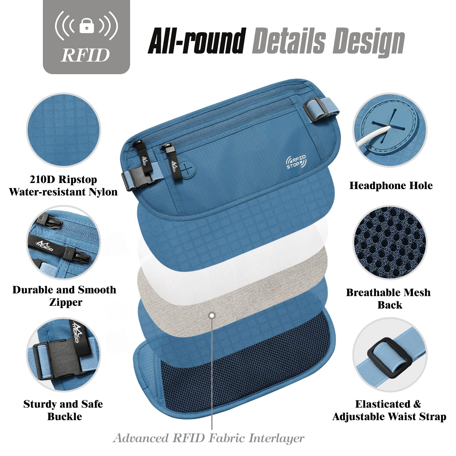 Description A Perfect Travel Companion to Keep Your Belongings Ultra-Safe and Enjoy Care-free Vacation! Whether you are travelling, out for a holiday, or on a business trip, this multi pockets money belt --- has roomy space to keep your passport, credit cards, smart phones, money, keys and other valuables in sight and within easy reach. and can be hidden underneath the clothes, provides full protection for your valuables upon travel or outdoor activities. Fit nicely on both men and women at almost any sizes! We use the most durable materials to make your experience as joyful as possible! The best ever travel accessory is now available, seize the moment, Add to Cart to keep your valuables safe on the go and travel with fun! CONSTRUCTION: Item Weight: 3.2 oz Waist Size: 16 - 37.5 in Material: 210D rip-stop nylon Pockets: 2 zipper pockets 2 mesh compartments 1 hidden pocket 1 earphone opening
