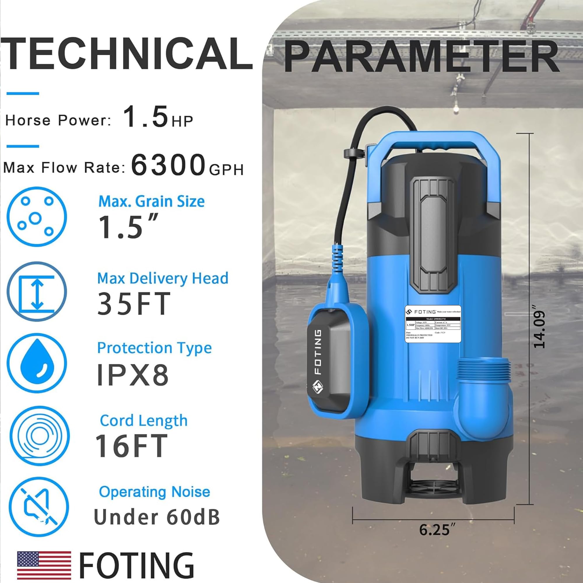 【1.5" SOLIDS AVAILABLE】6300GPH submersible pump can handle up to 1.5" solids and removes water down to 1.5 inch from the surface, making it perfect ideal for high volume sewage discharge, swimming pools, basement drainage and more