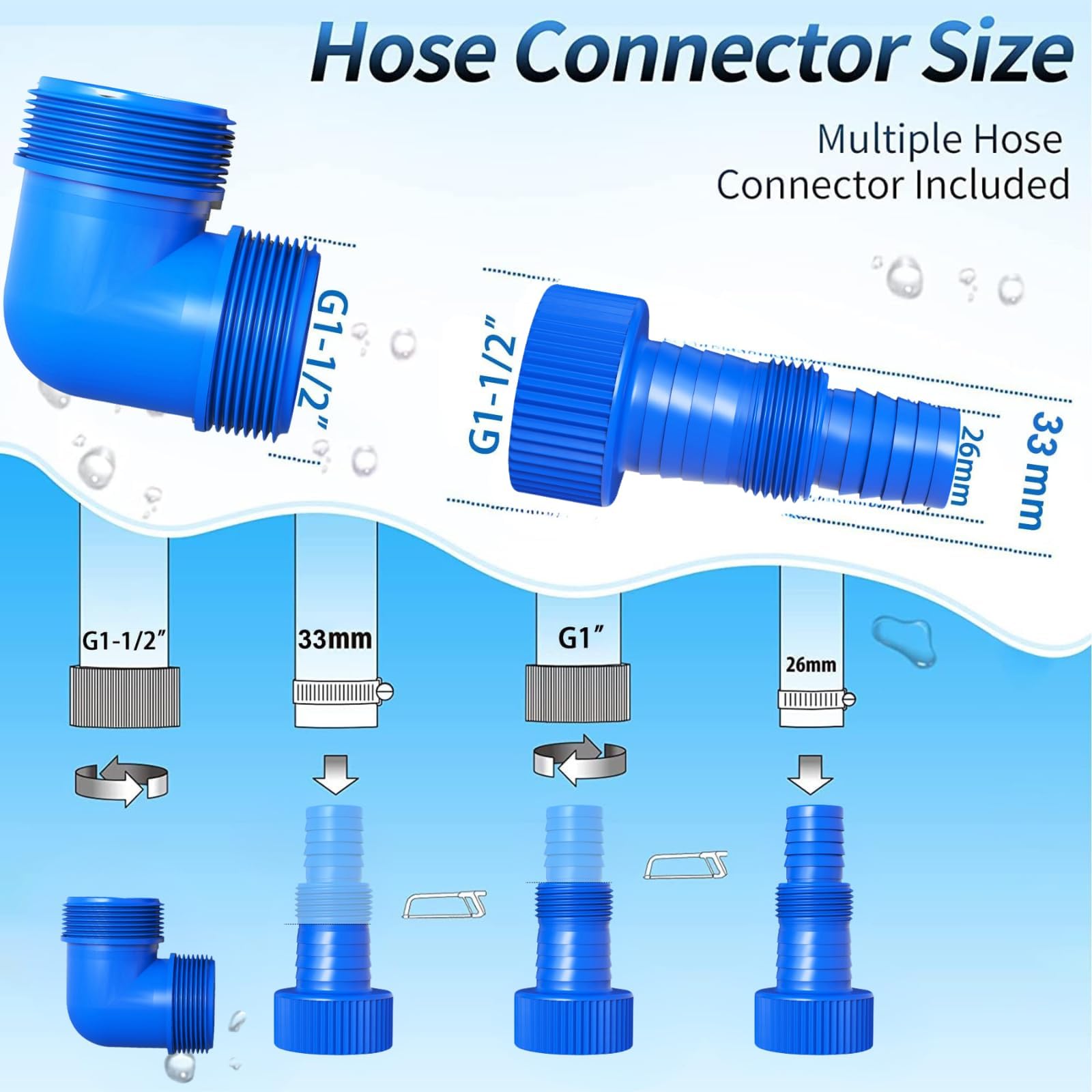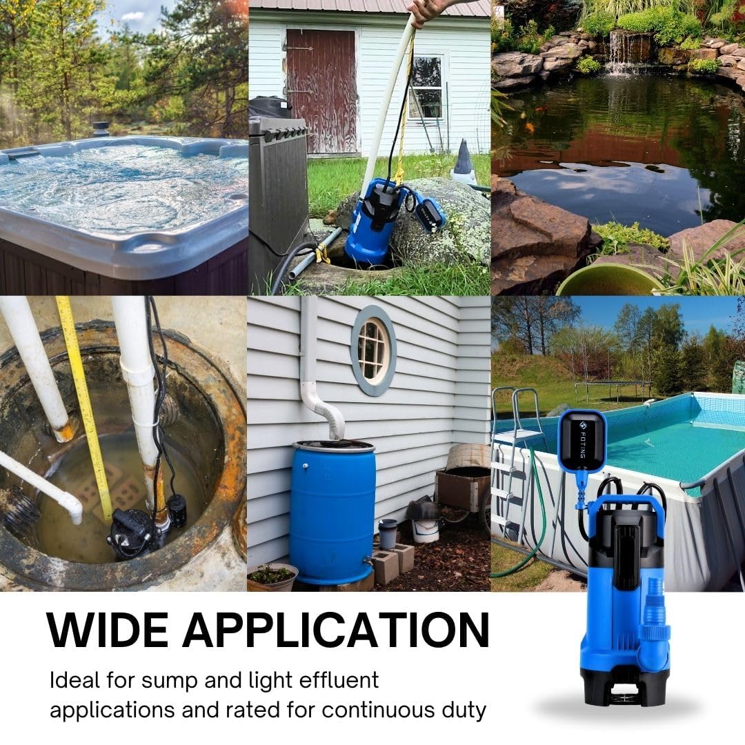 【EASY TO CONNECT】With NPT 1-1/2" discharge and GHT 3/4" discharge, and including hose adapter fits Ф1-1/2", Ф1-1/4", Ф1", GHT3/4" or NPT 1" hose. Suitable for flooded areas, swimming pools, cellars or garden ponds