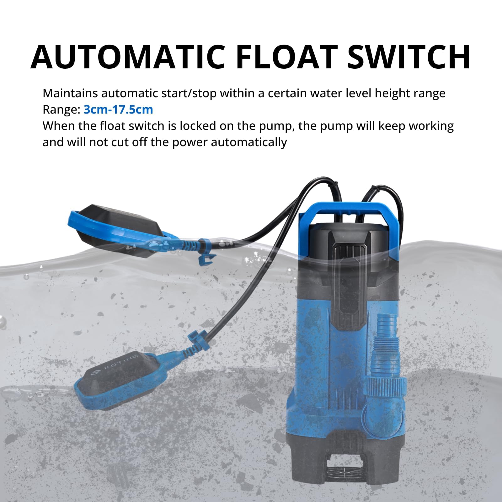 【AUTOMATIC&MANUAL MODE】Automatic mode: Automatically starts or stops work according to water level. Manual mode: Snap-on design of float switch can keep the floater uplifted for permanently working until plug off
