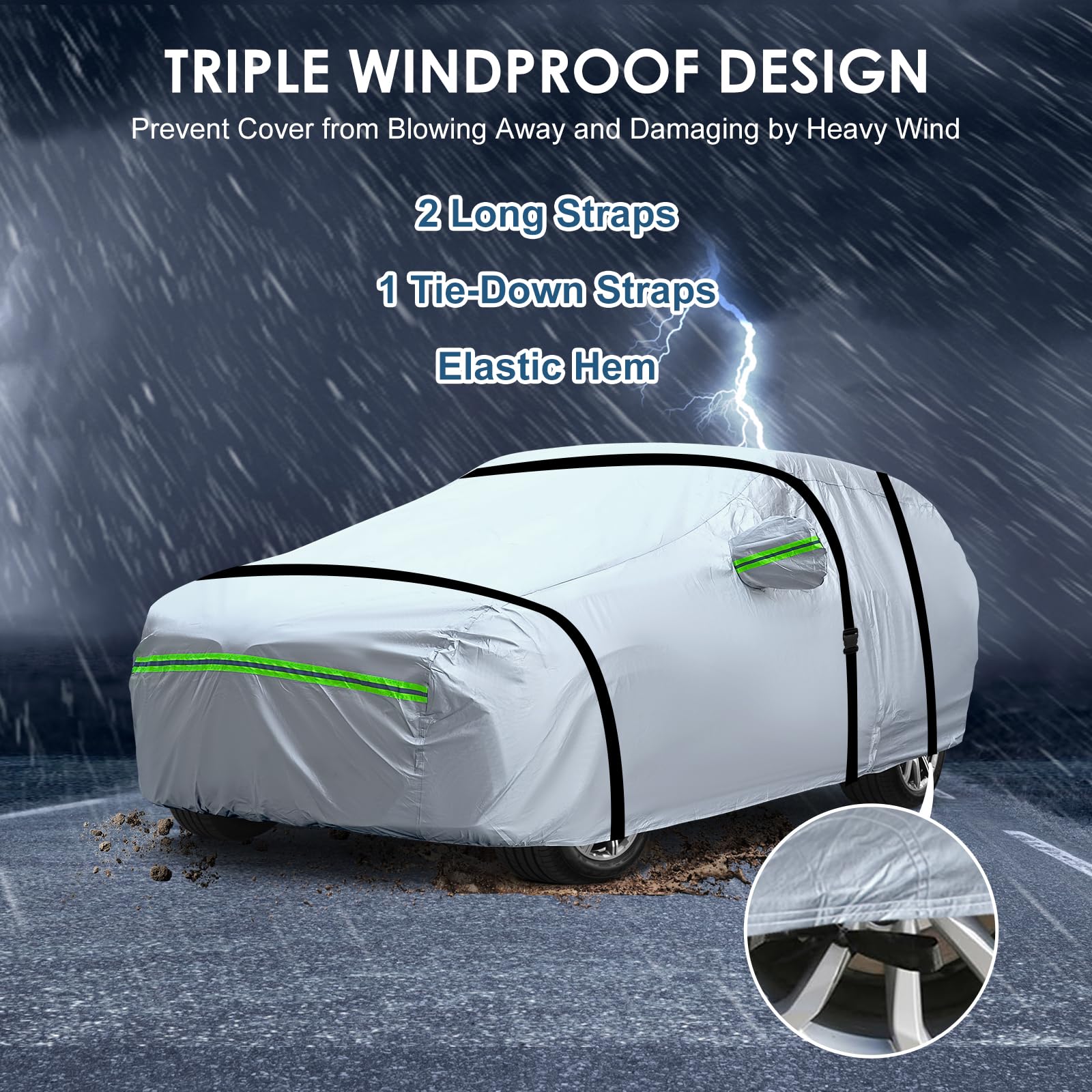 【PROFESSIONAL DESIGN】 ① Specially gifted is a widened windproof rope with a lock buckle, which can ensure that the car cover is not blown away by the wind during extremely strong winds. ② There is a door zipper on the left side of the entire hood, which is convenient for temporarily opening the door. ③ The front and rear of the car cover are designed with 2 long reflective strips to be more eye-catching at night. ④ Two windproof ropes can secure the front and rear of the car, ensuring that the car cover is not blown away by the wind.. ⑤ Enlarged mirror pockets make the entire car cover more suitable.