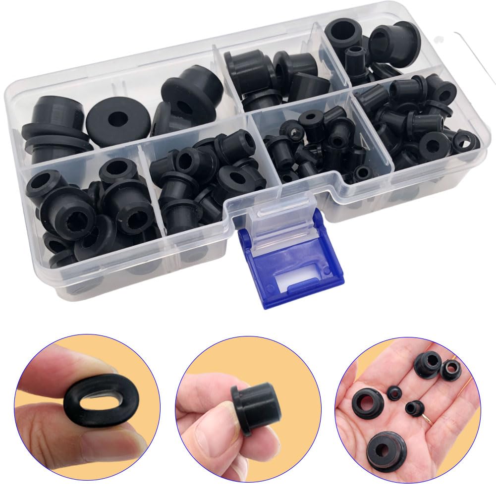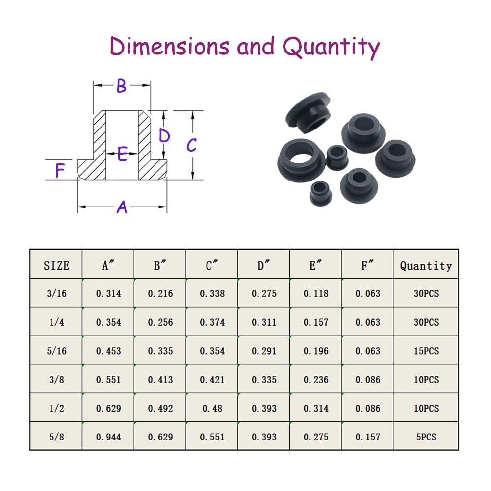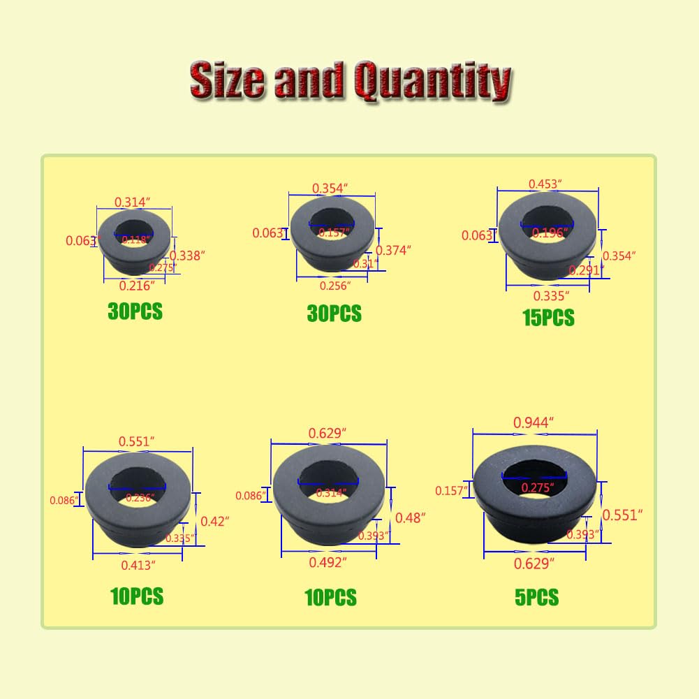 Silicone rubber grommets kit include 6 size(3/16" 30pcs, 1/4" 30pcs,5/16" 15pcs, 3/8" 10pcs, 1/2" 10pcs, 5/8"5pcs),total 100pcs silicone rubber grommet kit.