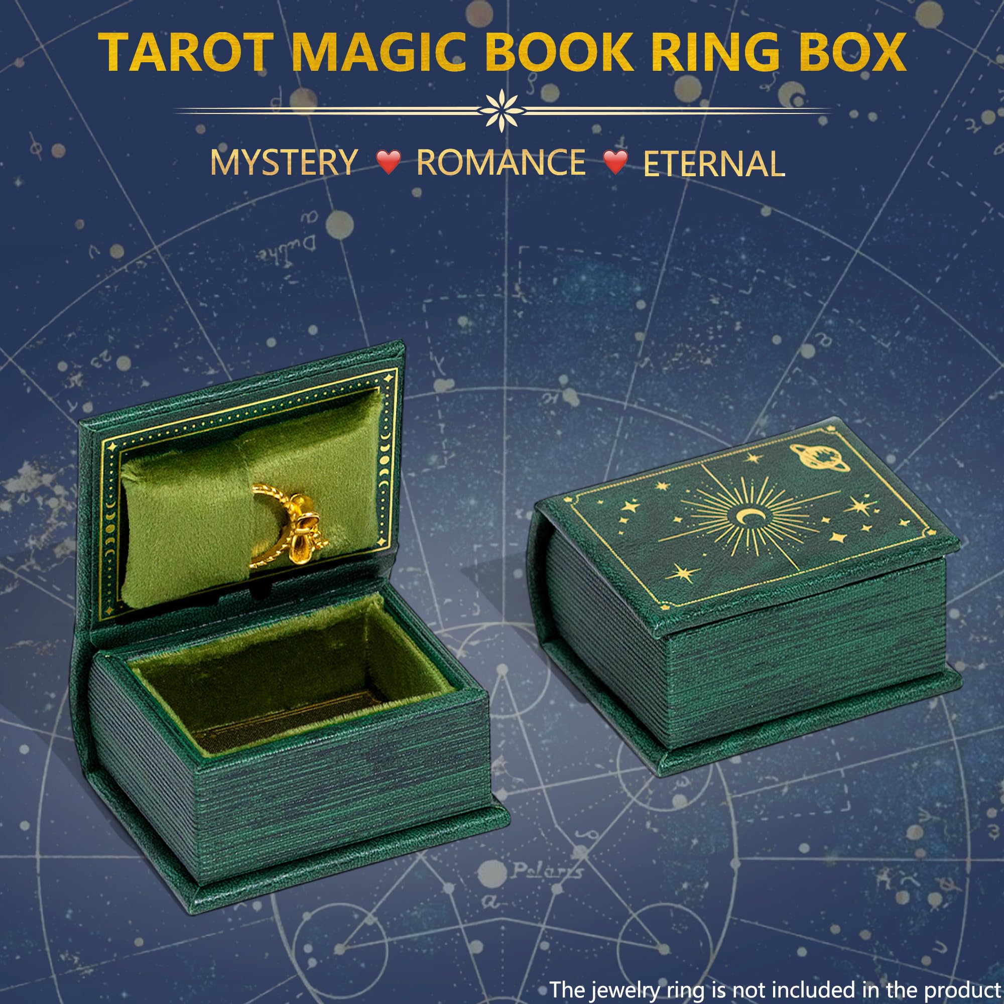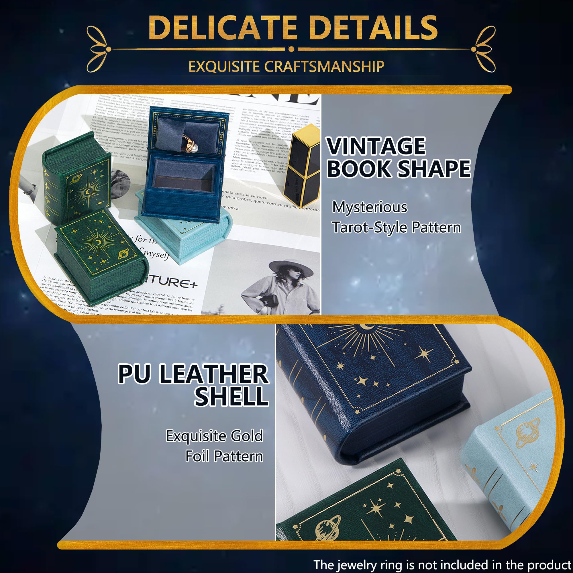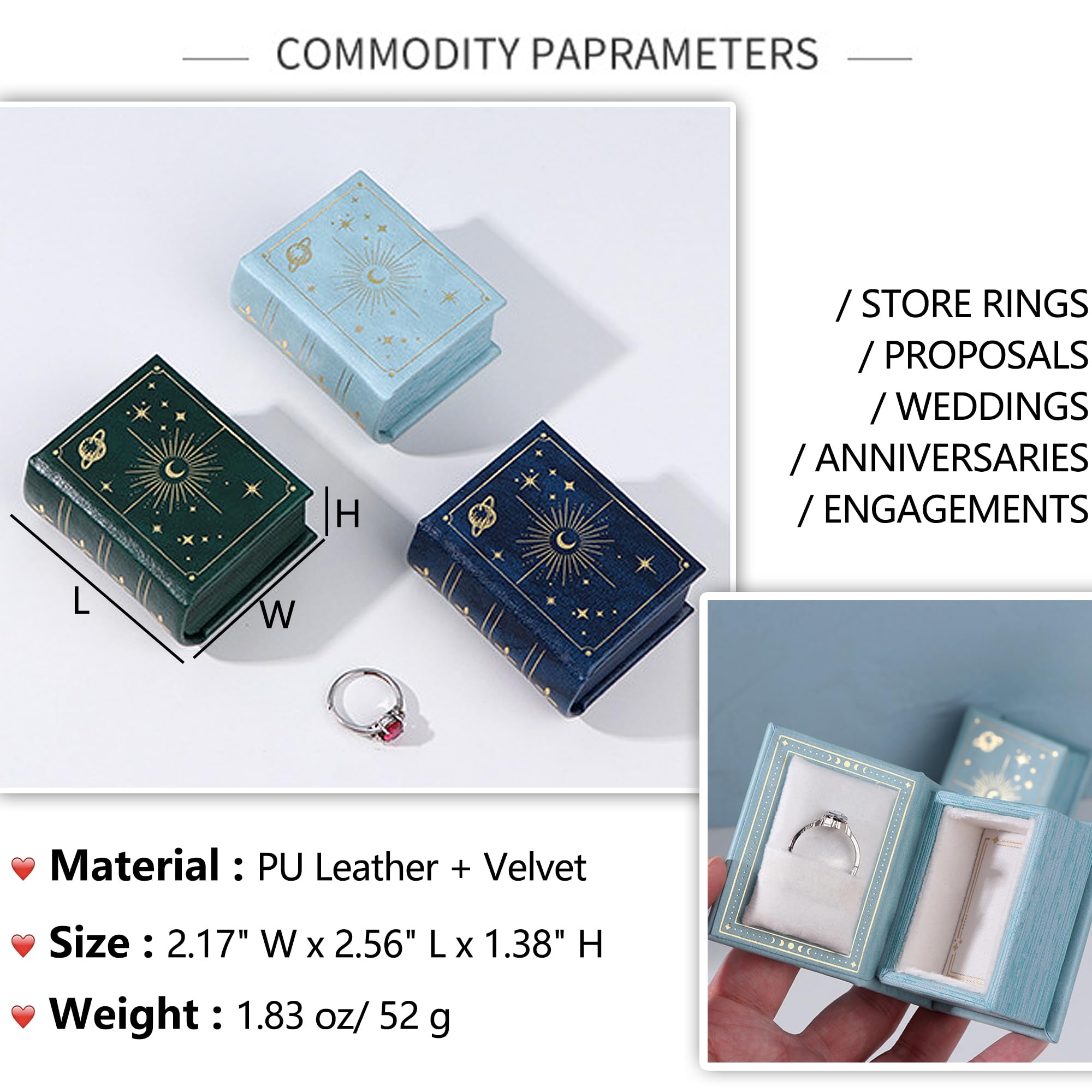 Application Scenarios ⭐Proposal Ceremony: Create a fairy-tale proposal with this book-shaped ring box, adding an extra layer of magic to the moment. ⭐Wedding Anniversaries: Celebrate your love with this elegant ring box as part of your anniversary surprise. ⭐Keepsake for Special Moments: This ring box isn't just for proposals. It can also hold your most cherished rings or be kept as a beautiful reminder of your love. ⭐Gift for Loved Ones: Ideal for gifting to those close to you who may be about to embark on their own journey of love and commitment. ⭐Home Decor: The vintage design makes this box a lovely addition to any home, serving as both functional and decorative. Tips: The product for sale is 1 ring box. The ring, jewelry, and other items shown are for demonstration purposes only and are not included in the sale.! About Dimensions: Measurements are manually taken, and slight discrepancies may occur. For any dimension-related questions, feel free to email us. About Color Deviation: Due to monitor variations and photography factors, there may be slight color deviation. Rest assured, it won't alter the product's inherent color scheme.