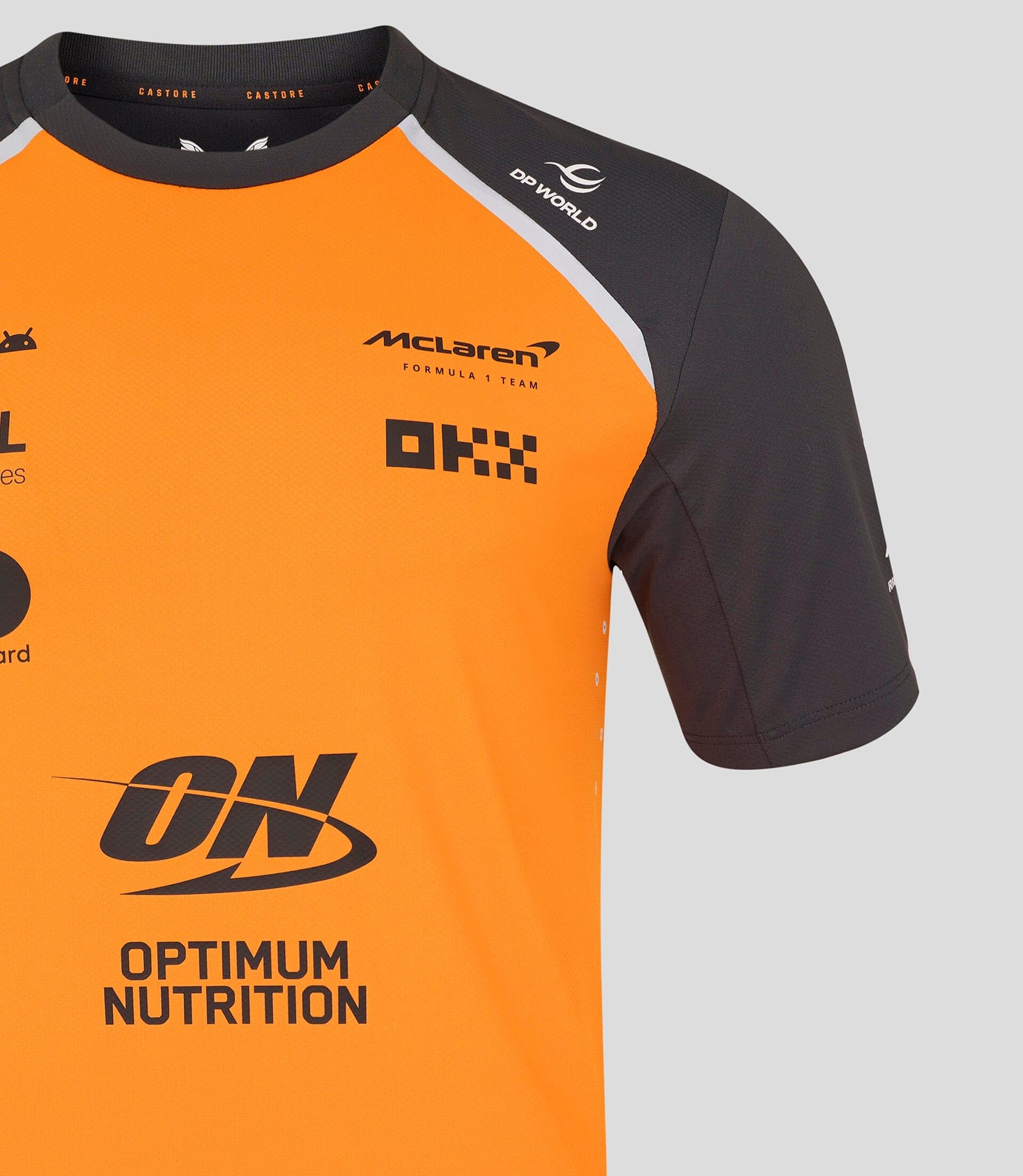 Description Meet the Official Men's McLaren Formula 1 Team Set Up T-Shirt, meticulously designed to fuel your motorsport enthusiasm. The dropped hem, paired with a snug, ribbed crew neck, ensures unrestricted movement and extended coverage. The classic fit top's lower-back mesh panel and precision-cut underarm ventilation promote superior airflow during intense moments. Show your allegiance with screen-printed team and sponsor logos adorning this performance jersey.