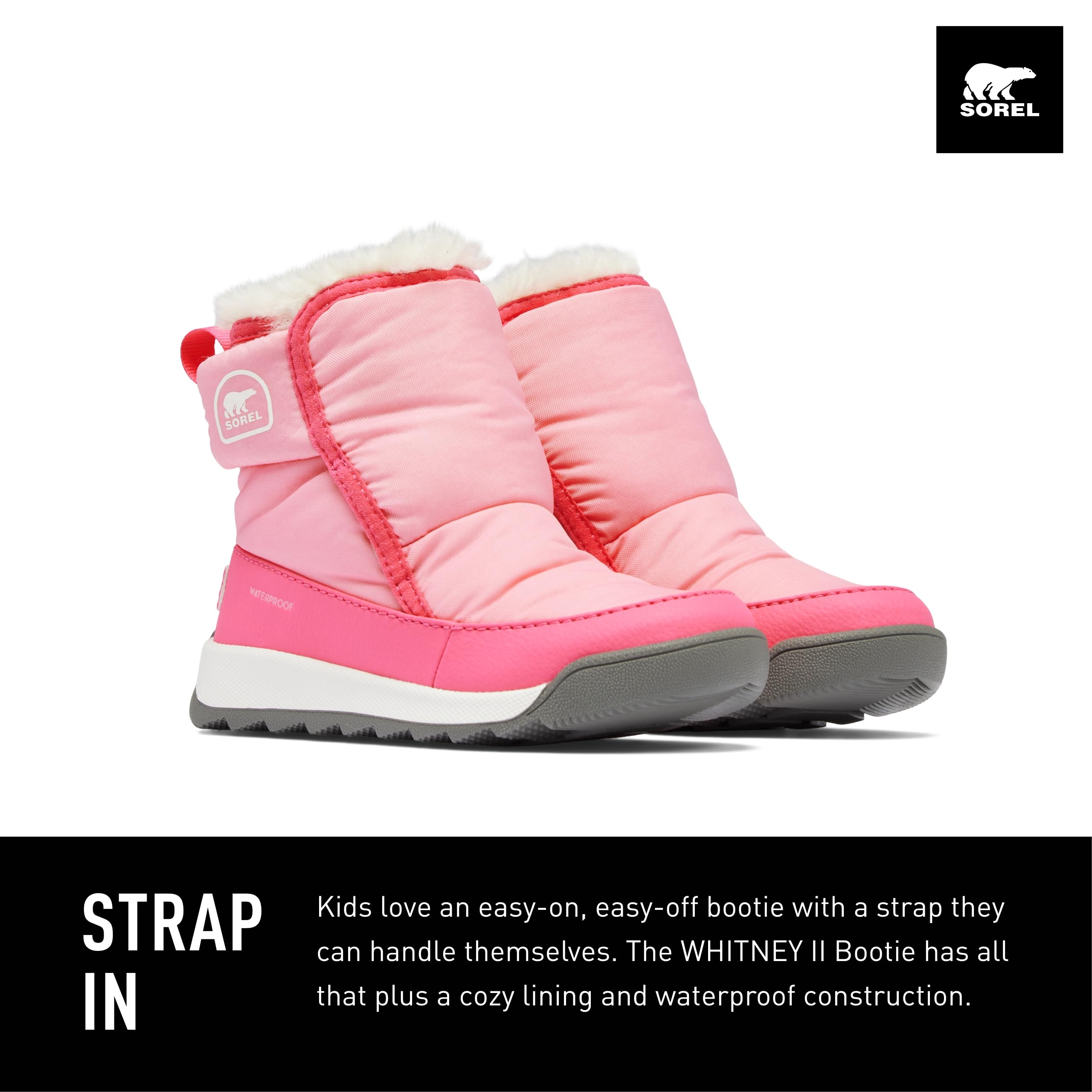 Description STRAP IN Kids love an easy-on, easy-off bootie with a strap they can handle themselves. The WHITNEY™ II Bootie has all that plus a cozy lining and waterproof construction. Other features of the TODDLER WHITNEY™ II Bootie Plus include: