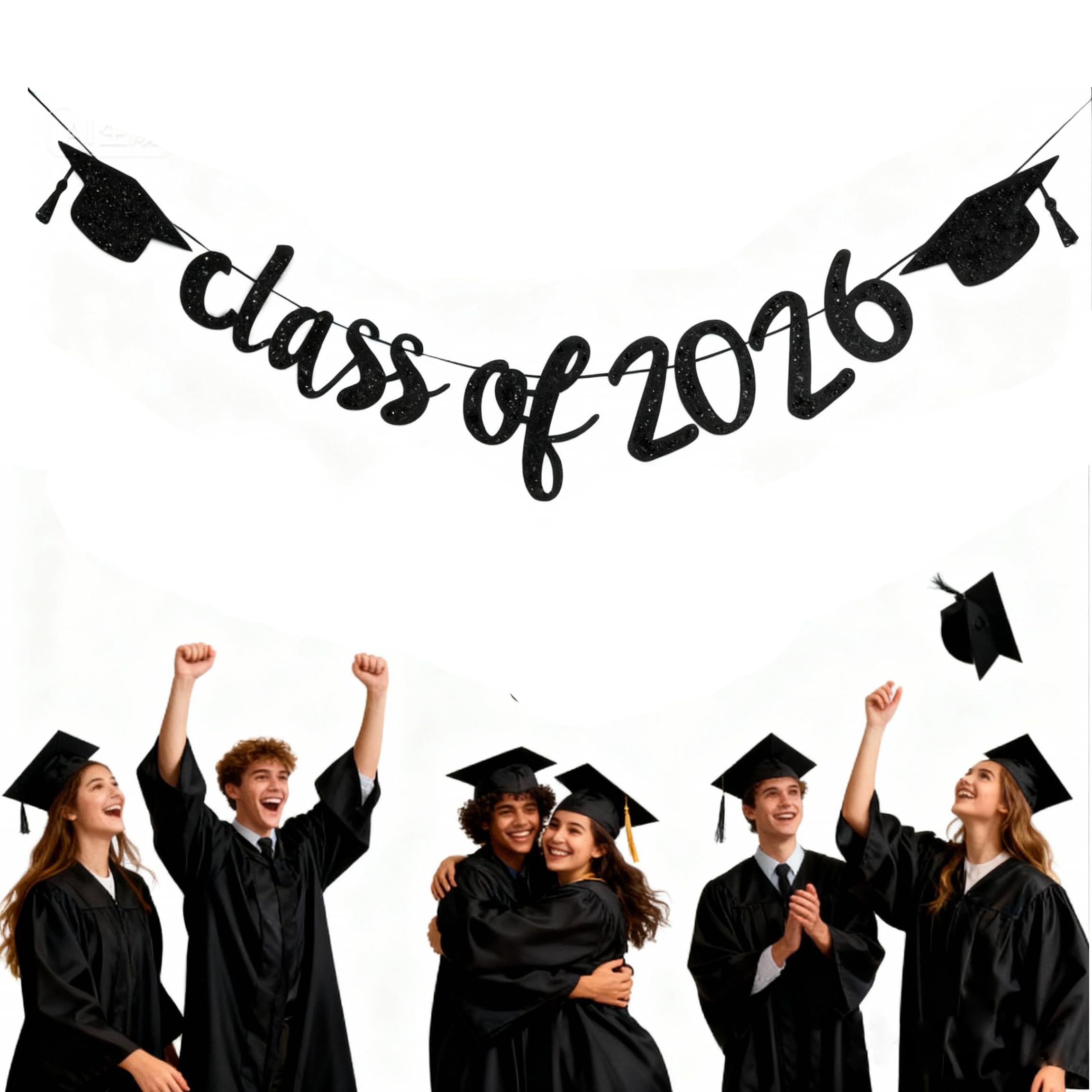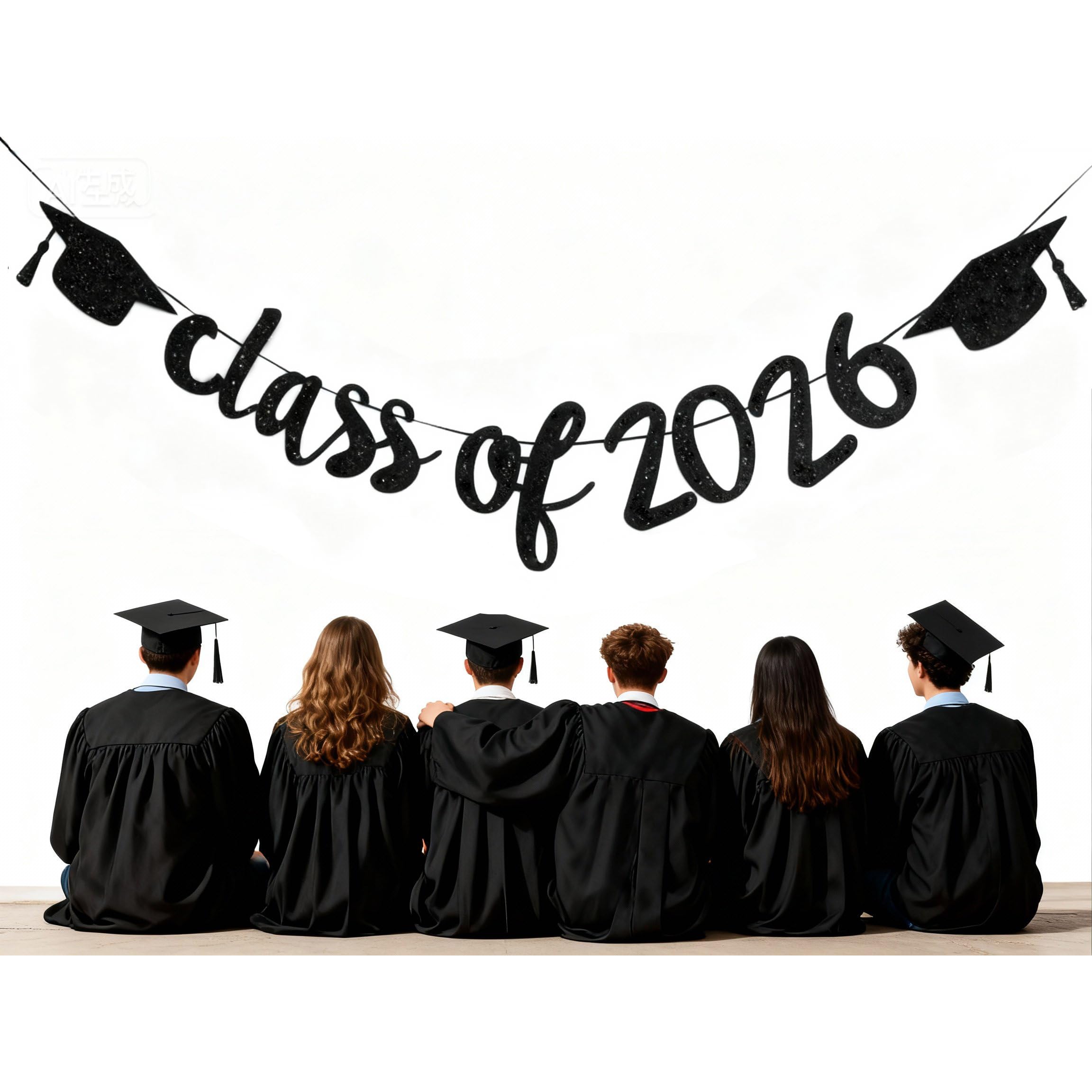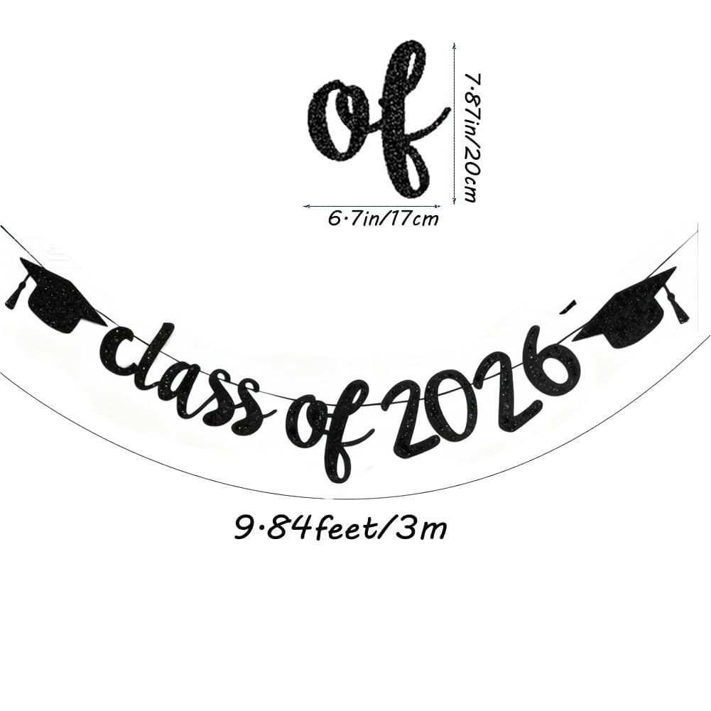 Package Included: 1pcs Gold Glittery 2026 with hat Graduation Banner, great for 2026 graduation party supplies decoration, and it come with 1 separate part: one part "2026", the part with approx 9.84 feet / 3meters rope.