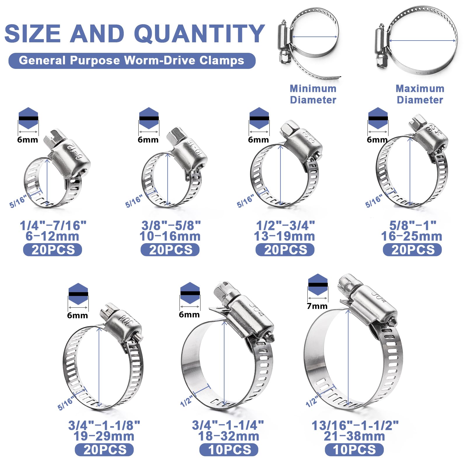 Wide Adjustable Size Range: Total 120 pcs hose clamps assortment are flexible and ductile, range from 1/4 inch to 1-1/2 inch (6mm to 38mm). 20pcs 1/4'' to 7/16'', 20pcs 3/8'' to 5/8'', 20pcs 1/2'' to 3/4", 20pcs 5/8'' to 1'', 20pcs 3/4'' to 1-1/8'', 10pcs 3/4'' to 1-1/4'' and 10pcs 13/16'' to 1-1/2''