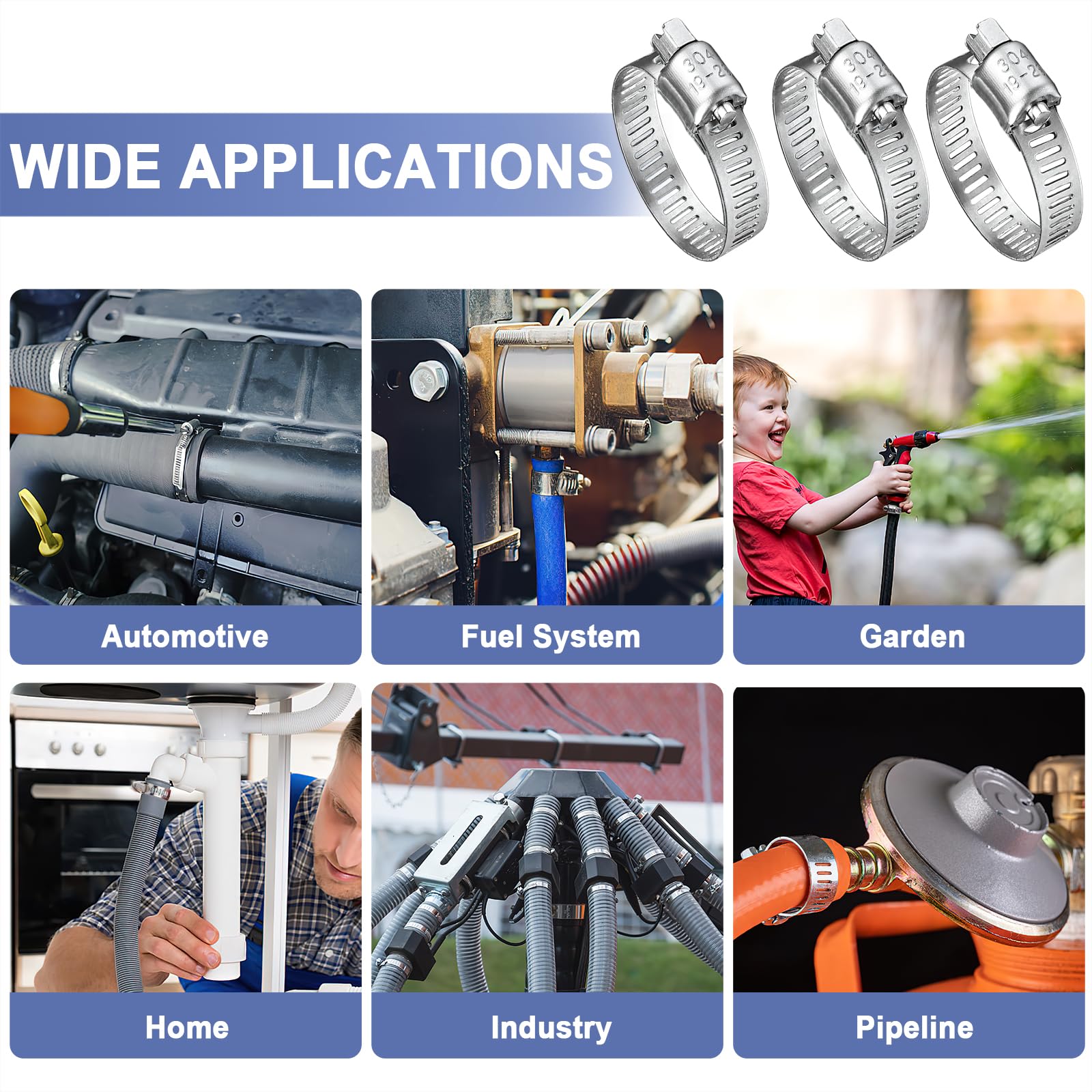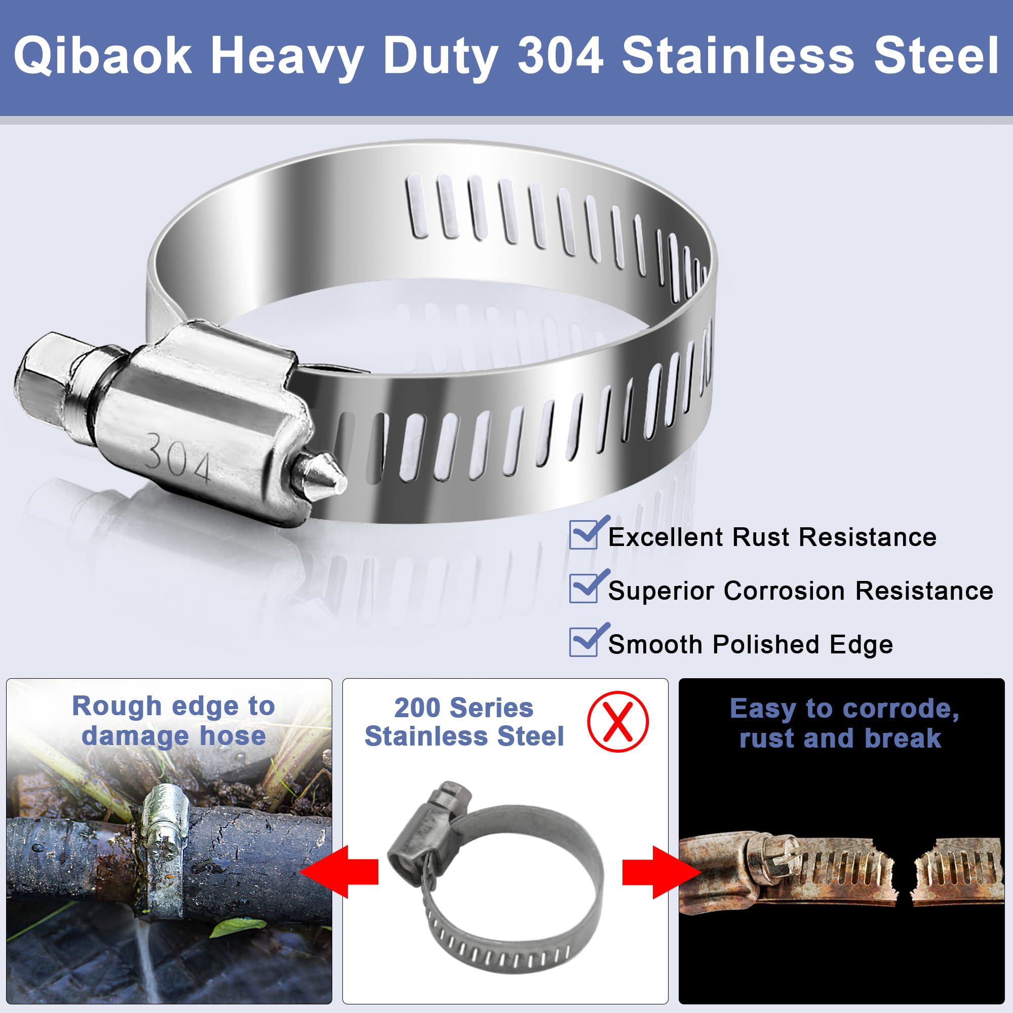 Hose Clamps Stainless Steel: The buckle, band and screw of these metal clamps are all made of heavy duty 304 SS. Hose clamp kit has the features of corrosion-resistant, anti-rust, salt resistant, waterproof and oil proof. No longer worry about them rusting and breaking when used in indoor and outdoor places