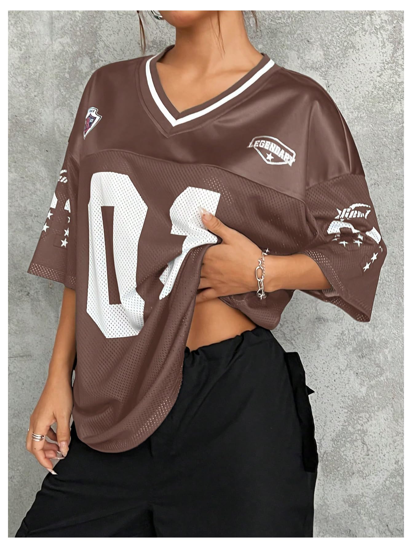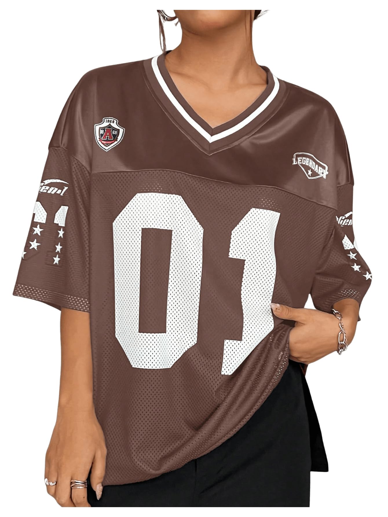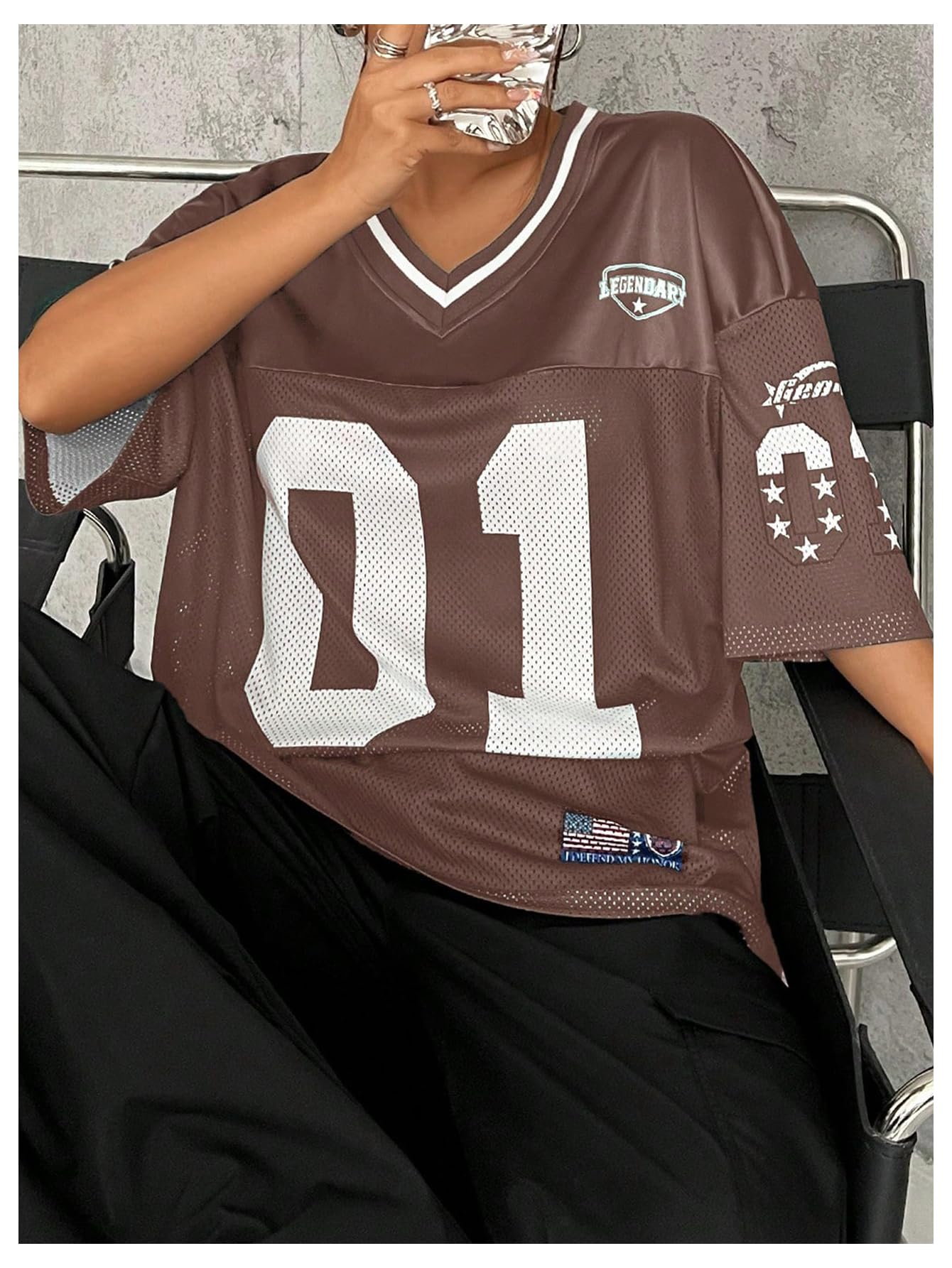 Features: trendy y2k jersey shirts, cute football jerseys, y2k graphic tee, oversized tee tops for women, going out tops for women, vintage t shirts, letter print, striped, mesh, v neck, half sleeve, drop shoulder, loose fit, fashionable