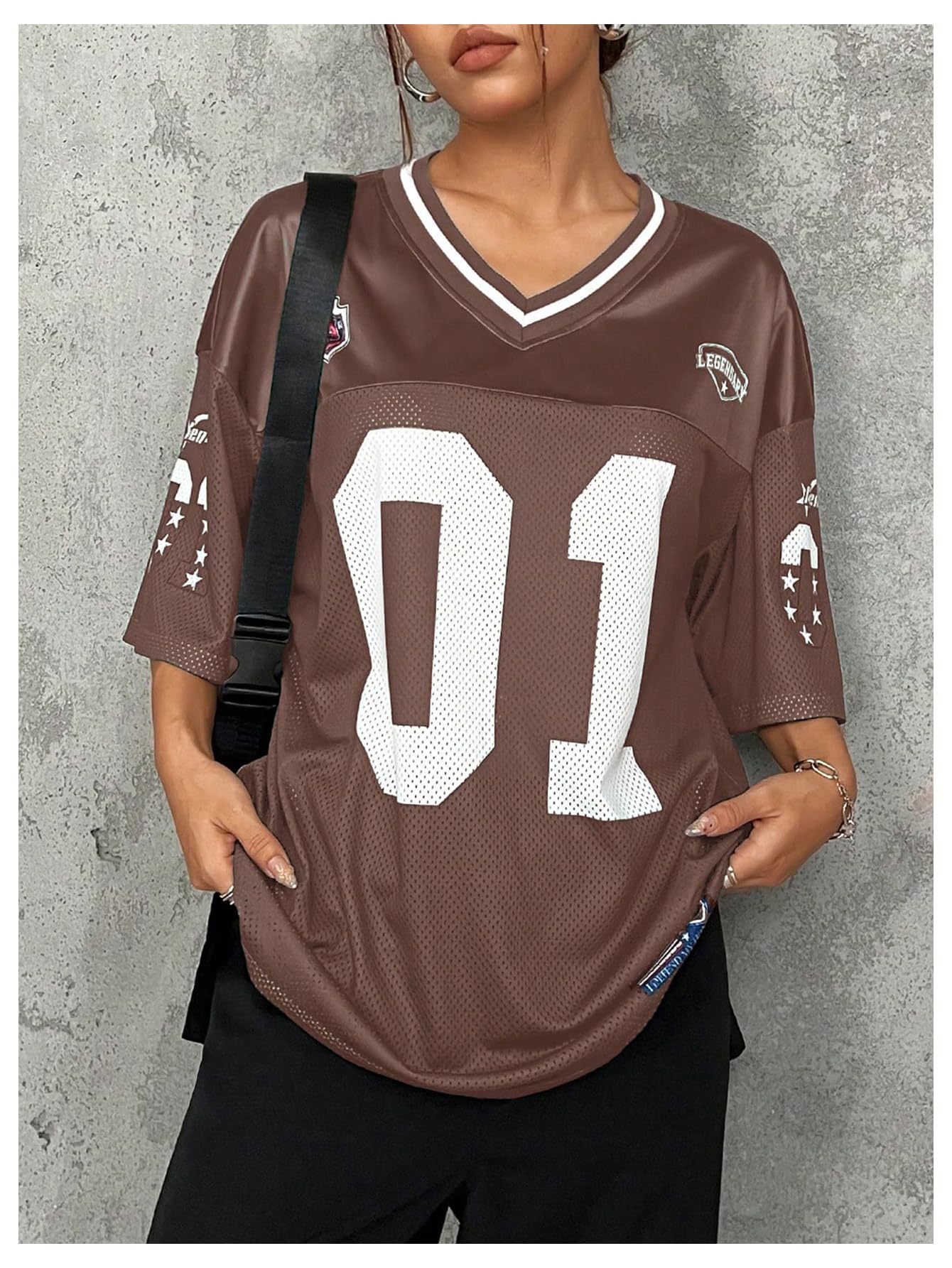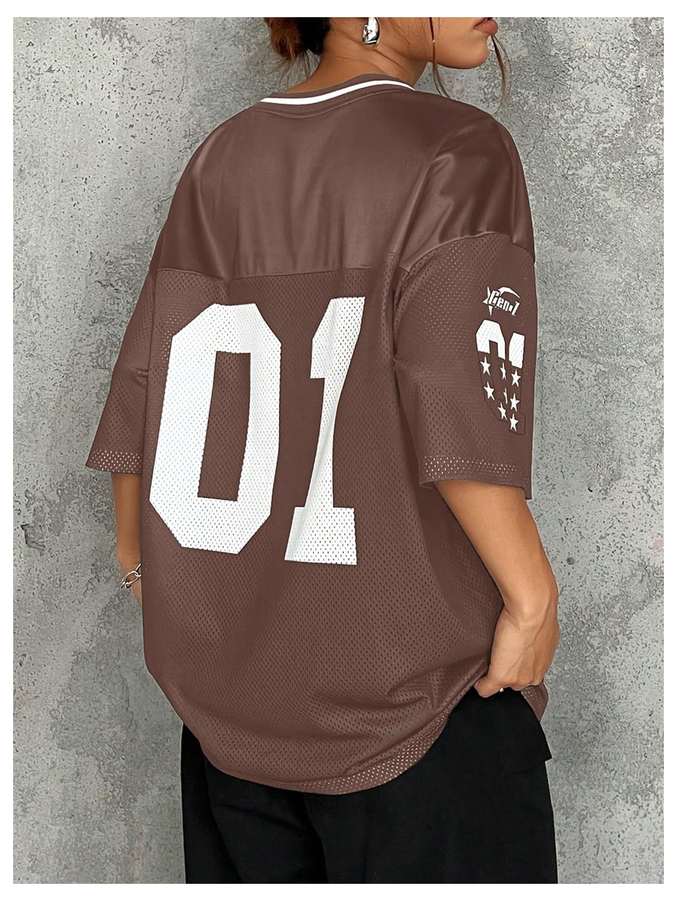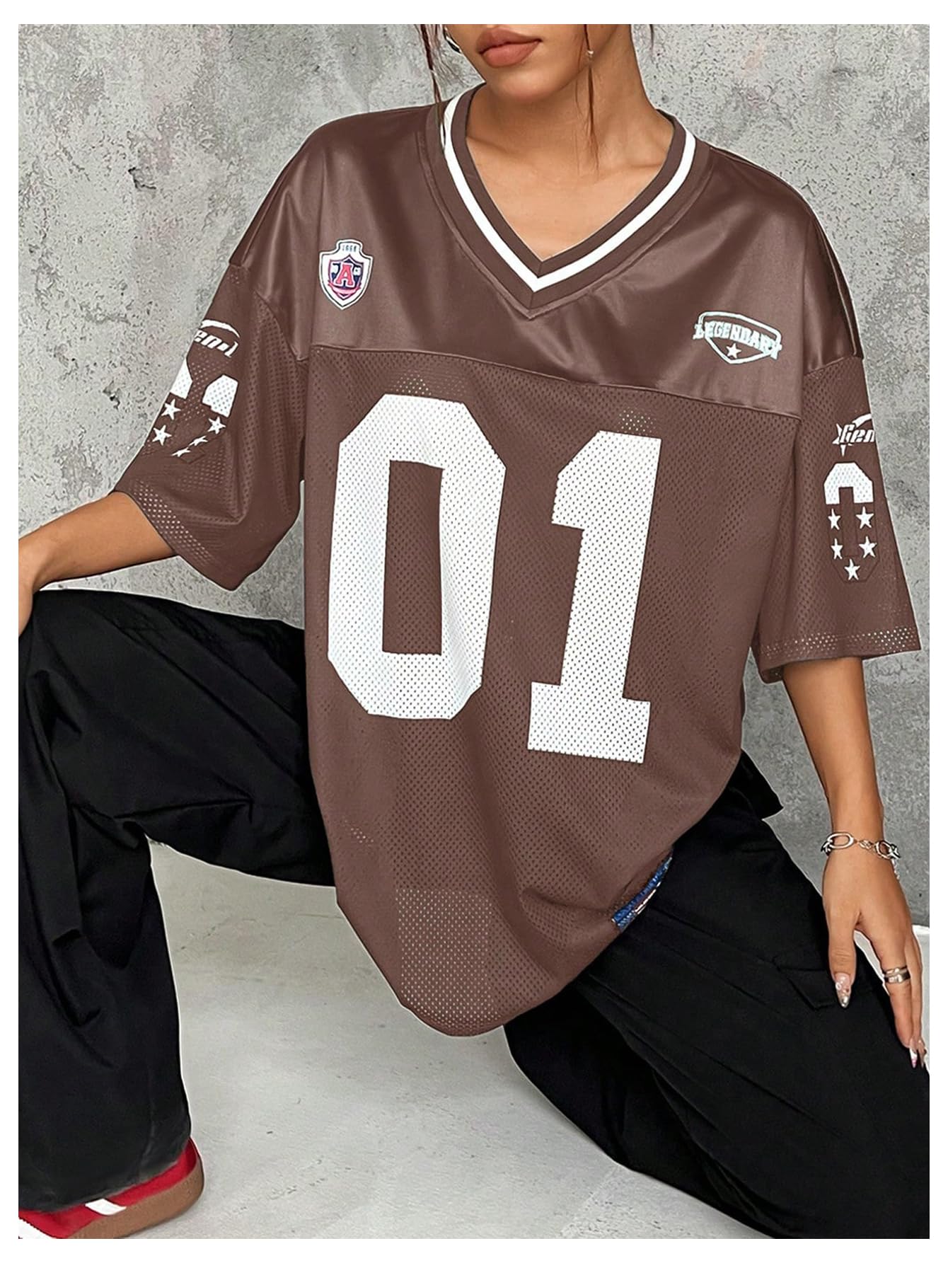 Features: trendy y2k jersey shirts, cute football jerseys, y2k graphic tee, oversized tee tops for women, going out tops for women, vintage t shirts, letter print, striped, mesh, v neck, half sleeve, drop shoulder, loose fit, fashionable