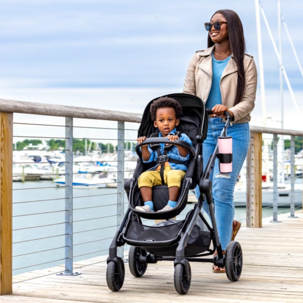 MAKE IT A DOUBLE: The easy slide and lock system expands the frame in seconds to accommodate a second toddler or infant seat without tools, extra parts or adapters