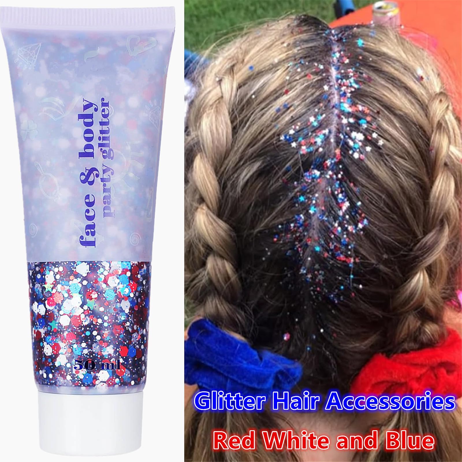 【Wide Applications Red White and Blue Face/Hair Glitter Holographic Effect】This patriotic Body Glitter Gel has red white and blue glitter,amazing effect with 4th of july outfits for women.Unique colors,rich with small and big different size hexagonal sequins in it,will see shiny after the glue dry,the sequins glitter makeup effect films like a rainbow,looks signature Hologram Sparkle.It shines brightly on the face, shoulders, and clothes, creating a strong festive atmosphere.Glitter red white and blue hair accaccessories for girls.
