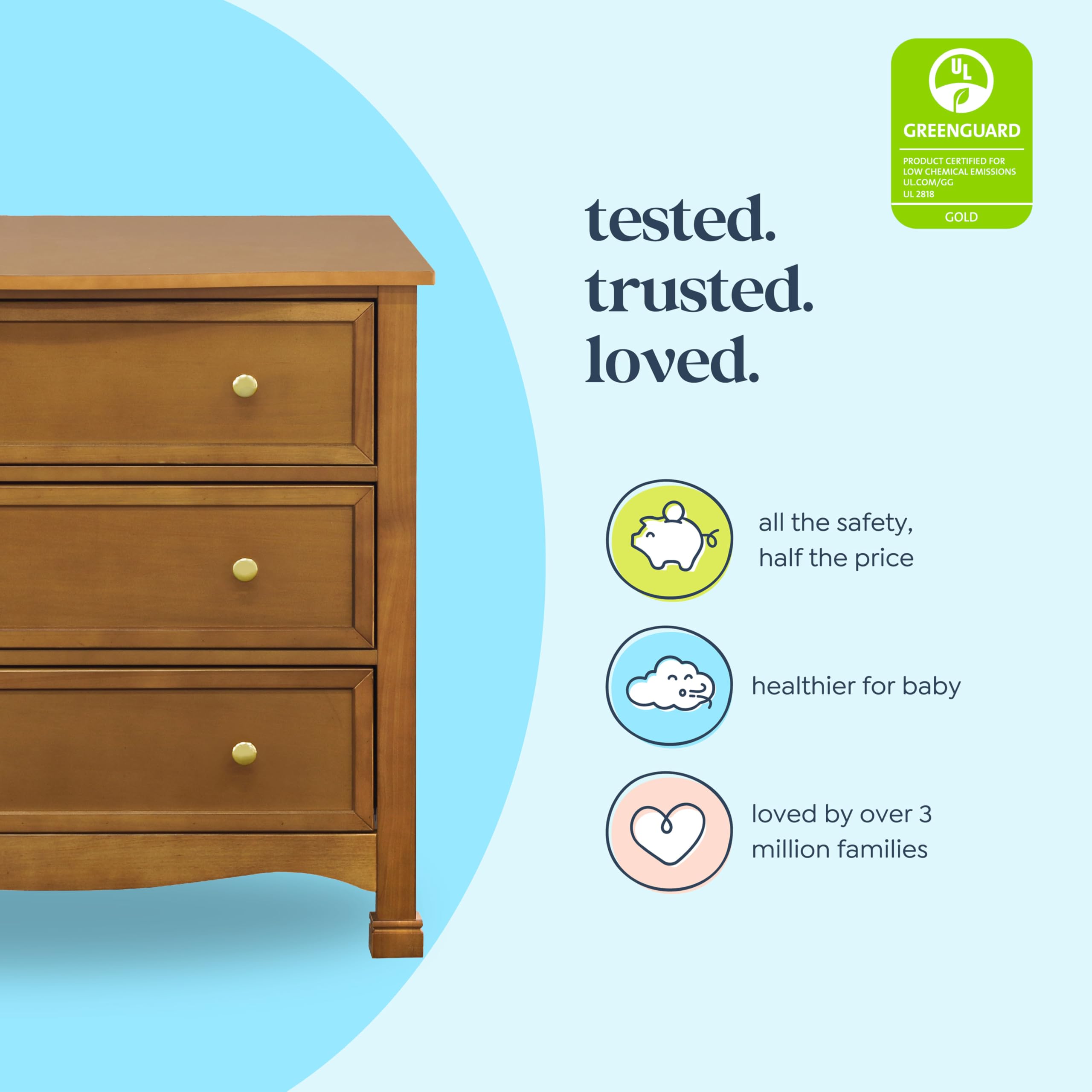 The Kalani 3-Drawer Dresser features roomy drawers providing ample storage for any nursery or home. The dresser is detailed with recessed front drawer panels, a gently curved apron front and curved top sides