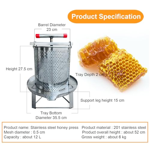 【Item Specification】- Honey Presser Material : Stainless Steel, Bottom to Frame Height : Approx. 43 cm / 16.9 in, Bottom Tray Diameter : Approx. 35 cm / 13.8 in, Barrel Diameter : Approx. 23 cm / 9 in, Weight : Approx. 5.6 kg / 12.35 lb.