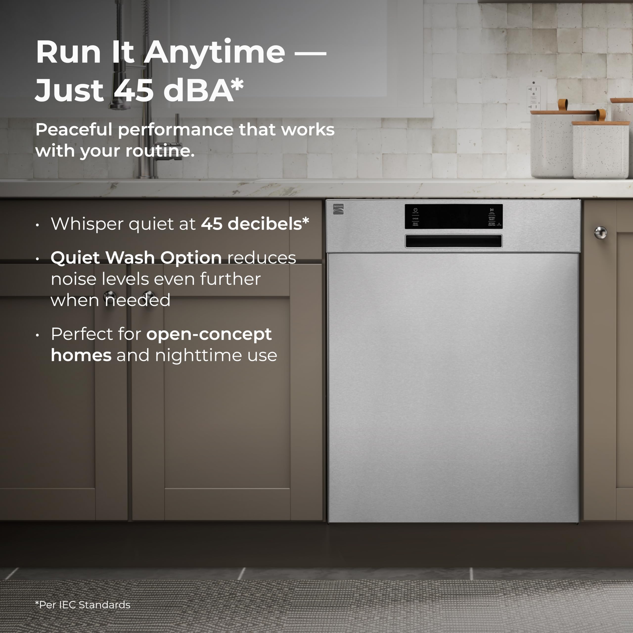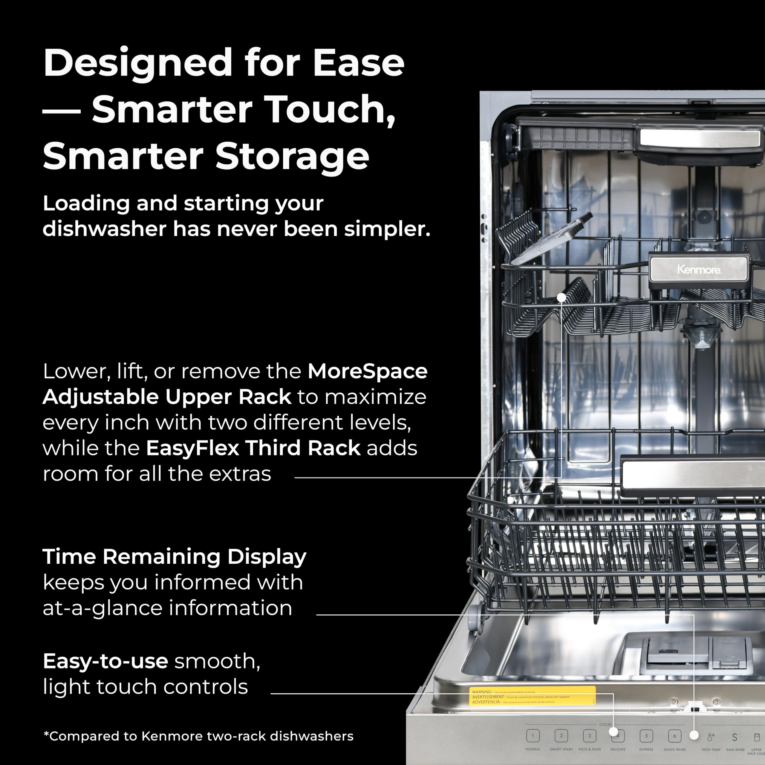 The Kenmore 24" Built-In Dishwasher delivers powerful, efficient cleaning with whisper-quiet performance. UltraWash Plus blasts away stuck-on food with pressurized spray arms and filtered water, while the SmartWash cycle adjusts to soil level for the best clean. TurboDry uses a built-in fan and heating element to ensure every dish comes out dry - no towel needed. The EasyFlex Third Rack adds 35% more space for cooking tools, and the MoreSpace Adjustable Rack lifts or lowers to fit large or awkward items. With space for 15 place settings, running at 45 dBA with a Quiet Wash option, and Delay Start flexibility, it’s built for everyday life. ENERGY STAR Certified and equipped with Leak Detection for added peace of mind.