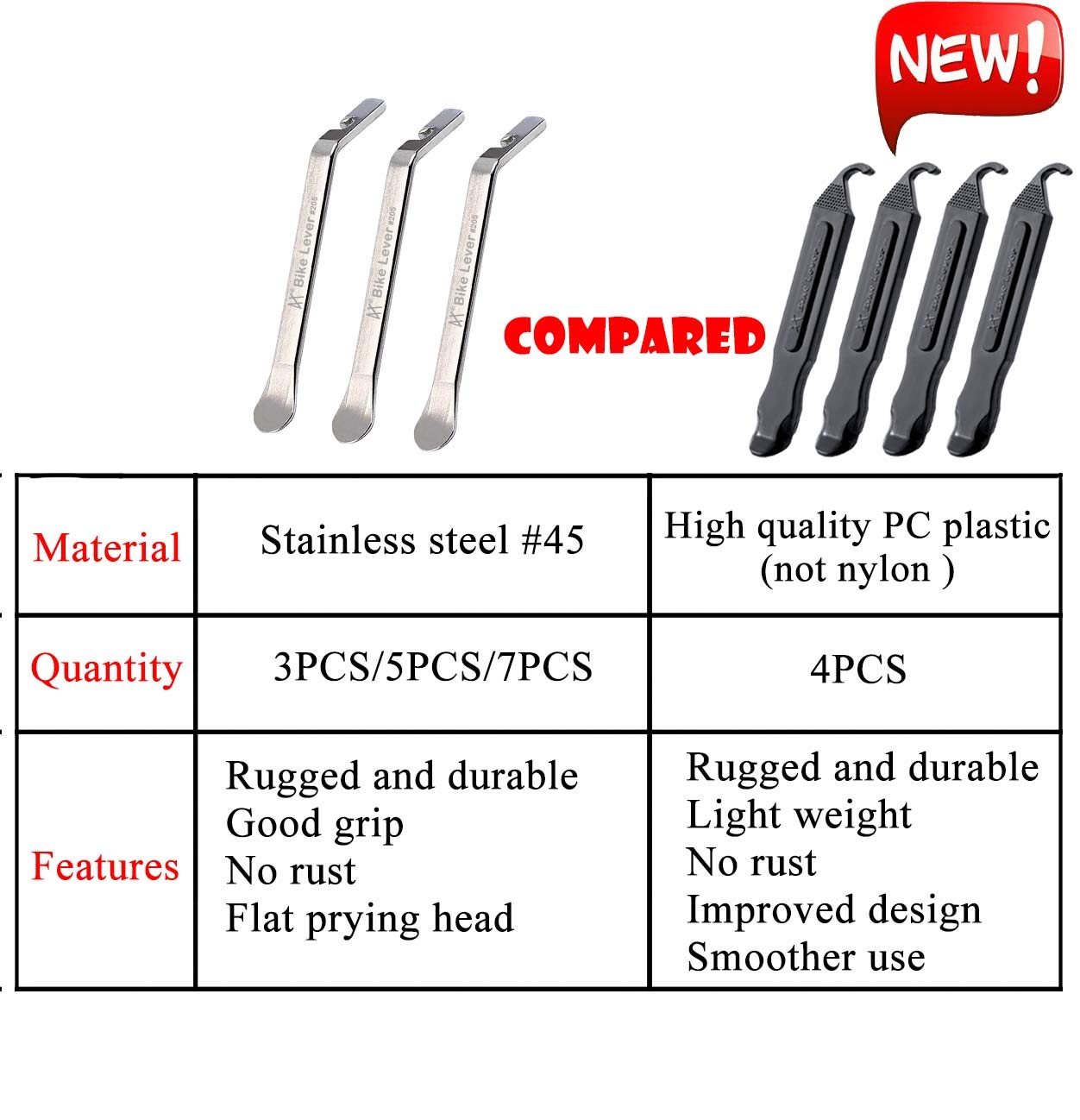 Material : Stainless Steel Material, durable, not rust, strong enough to remove some of the toughest tires.Tools are overall sleek, which will not hurt your rims pry