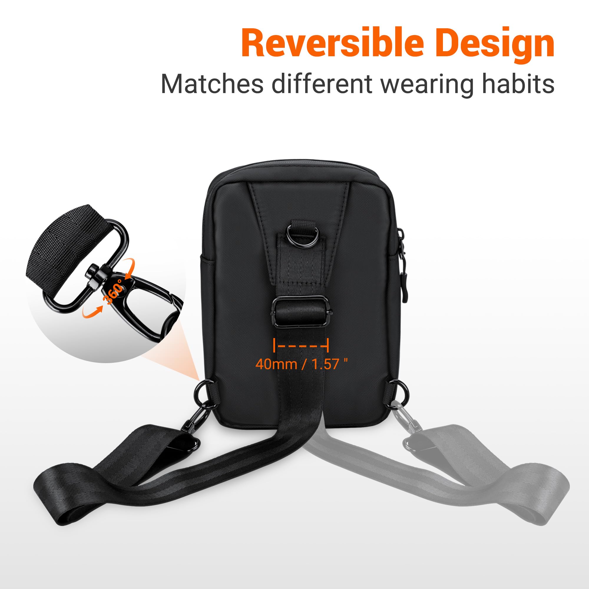[Adjustable strap] Equipped with a breathable, widened shoulder strap, it effectively reduces pressure and fatigue. The strap connects to a premium metal buckle on a D-ring at the back side, adjustable from 34.25 to 53.15 inches (87-135 cm). You can choose between the left or right D-ring based on your preference. Additionally, another D-ring on the top provides a convenient spot for hanging items like keychains or decorative accessories.