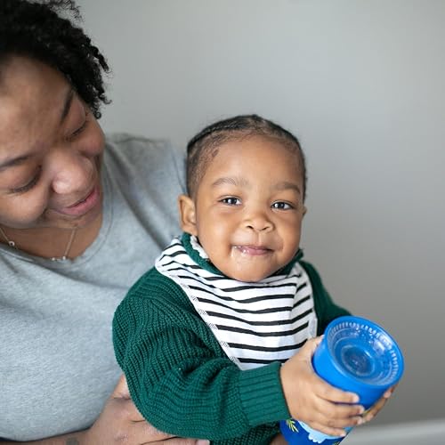 Make their transition to a big kid cup a success with Dr. Brown’s Milestones Cheers 360 Spoutless Cup with Handles. This 360-degree sippy cup lets baby drink from any edge, and the Sip and See clear silicone valve lets baby see inside without spilling for true leak-free learning. Handles designed with your little one in mind are easy to grasp and tilt while developing independent drinking skills. The three-piece design makes assembly and cleaning a cinch! As baby’s drinking skills improve, just remove the valve to use as a true big kid cup. The translucent sides make it easy to tell when it’s time for a refill. Baby will go wild for cute animal prints! This sippy cup for babies and toddlers comes with a travel-friendly lid. Dishwasher safe (top rack) and BPA-free.