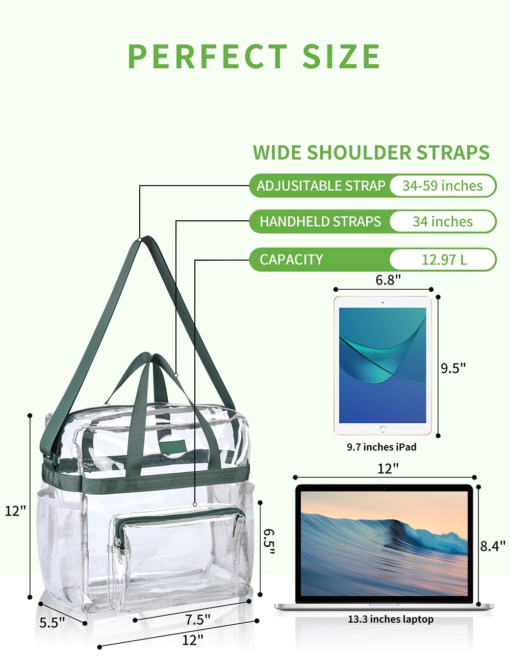 【Fitted Size】The clear bag for stadium events has a main compartment(12"x 5.5"x12"). Big enough for carry-on items like cellphone or camera. The front pocket (7.5"x6.5") and 2 mesh pockets are handy to store your essentials or drinks.