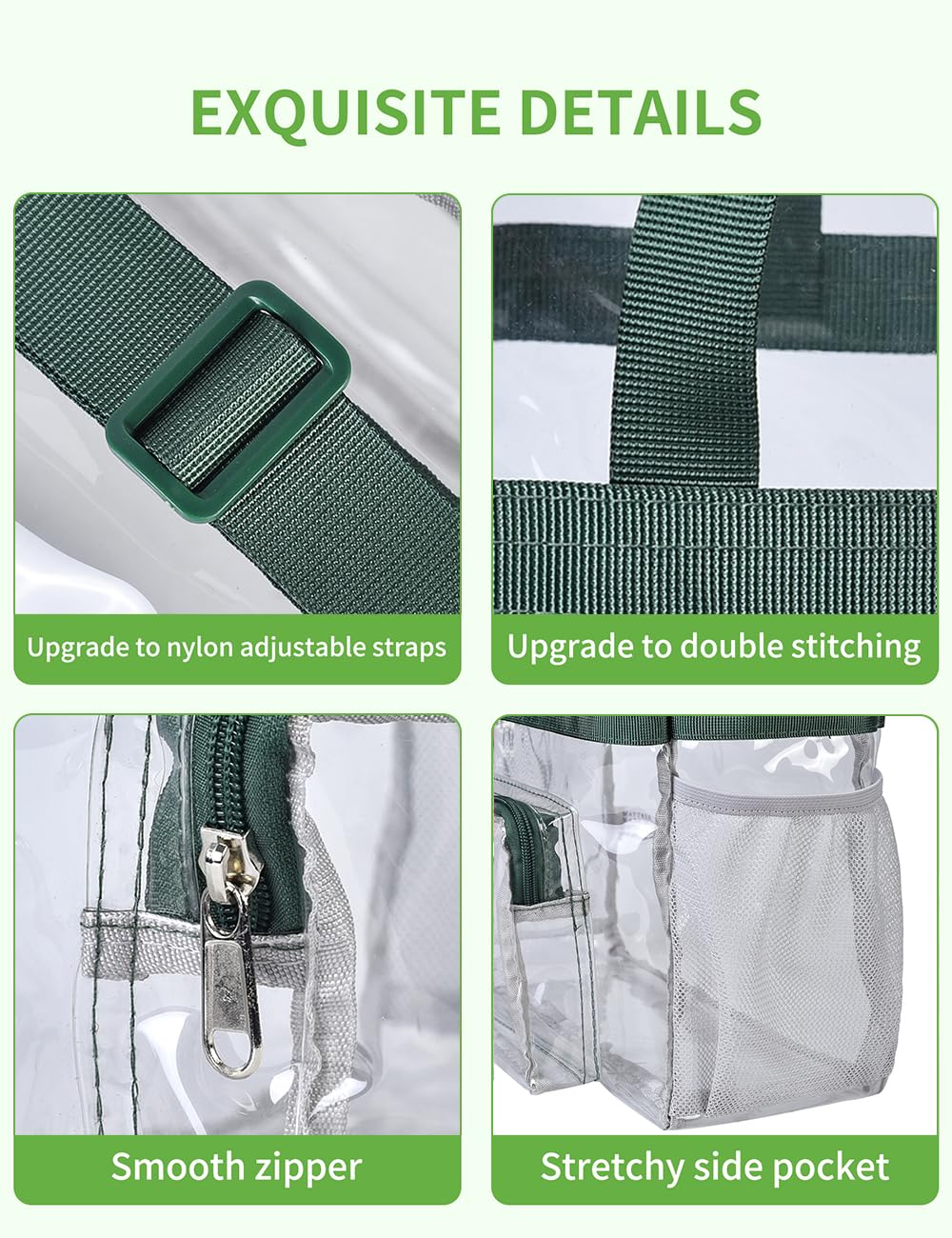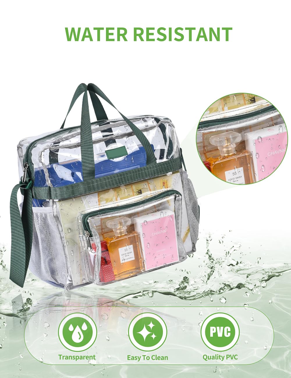 【Water Resistant】The PVC material makes this clear bag water-resistant. No more worries of a sudden rain or splashing water. Easy to be cleaned for next use.