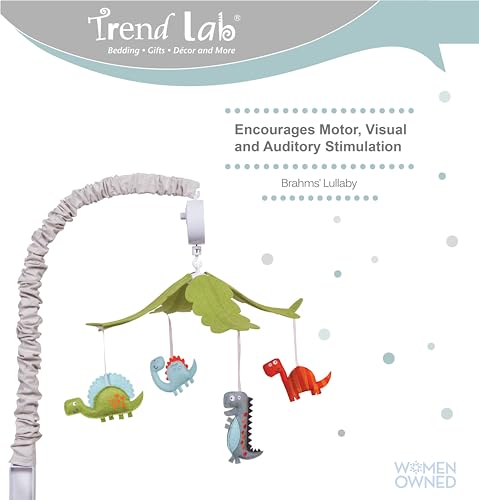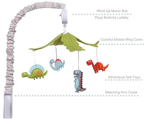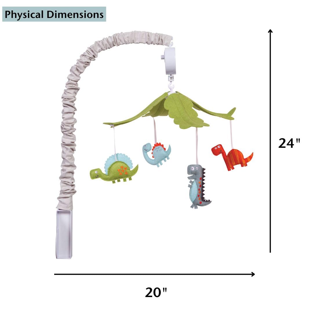 LEARN AND GROW: Your baby will love seeing the dancing rotating plush dinosaurs on their crib mobile set against a green leaf top. Help captivate your baby's imagination and develop visual tracking, motion vision, auditory processing, and cognitive growth while relaxing them with this soothing musical mobile for cribs. This whimsical mobile hanger plays the relaxing Brahms Lullaby.