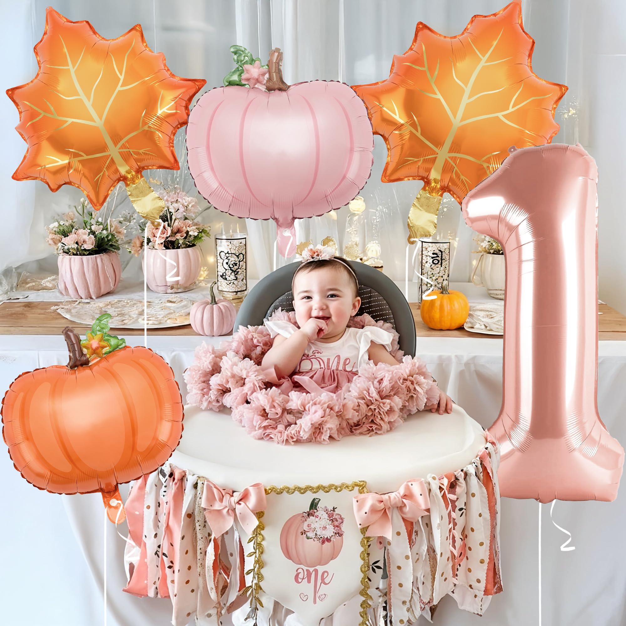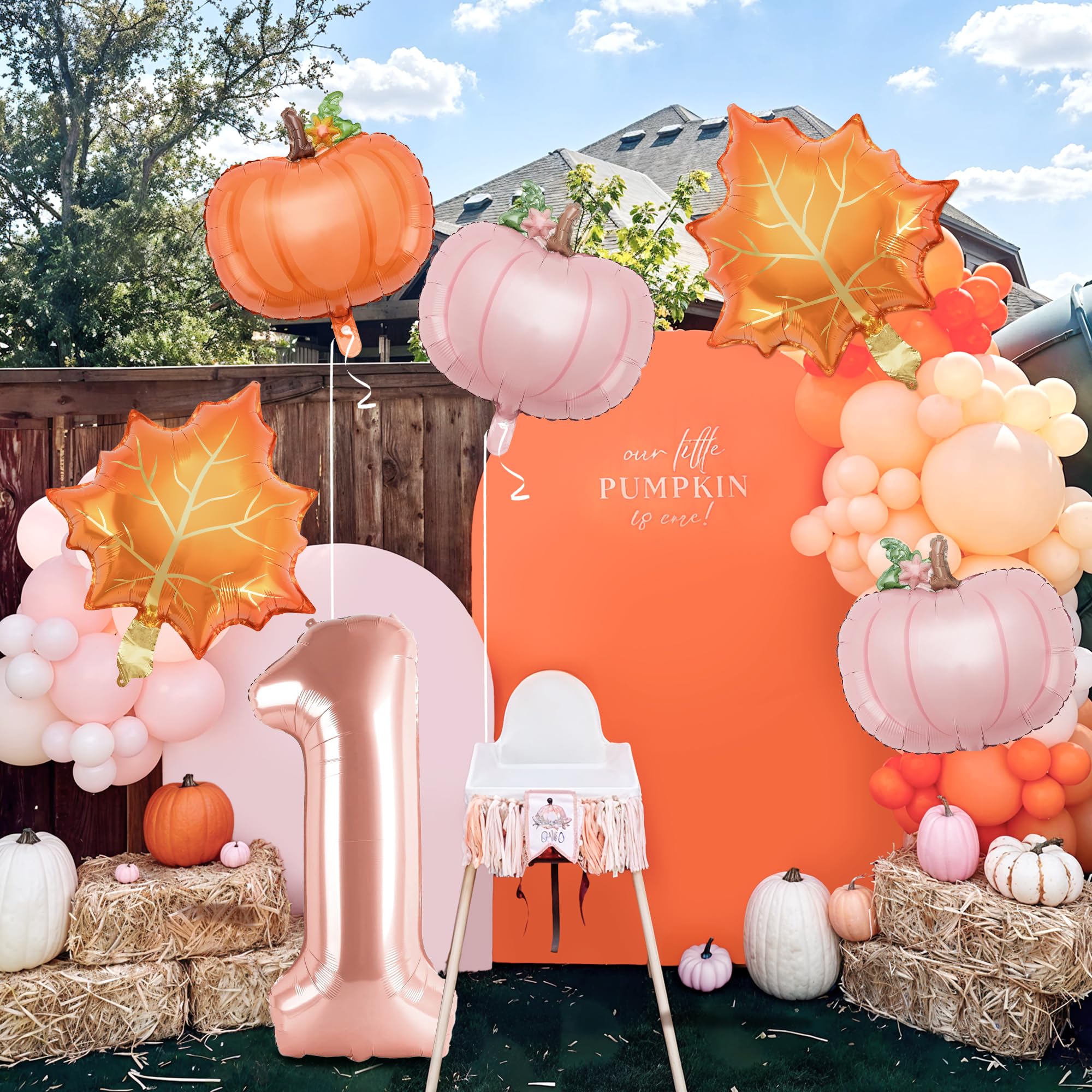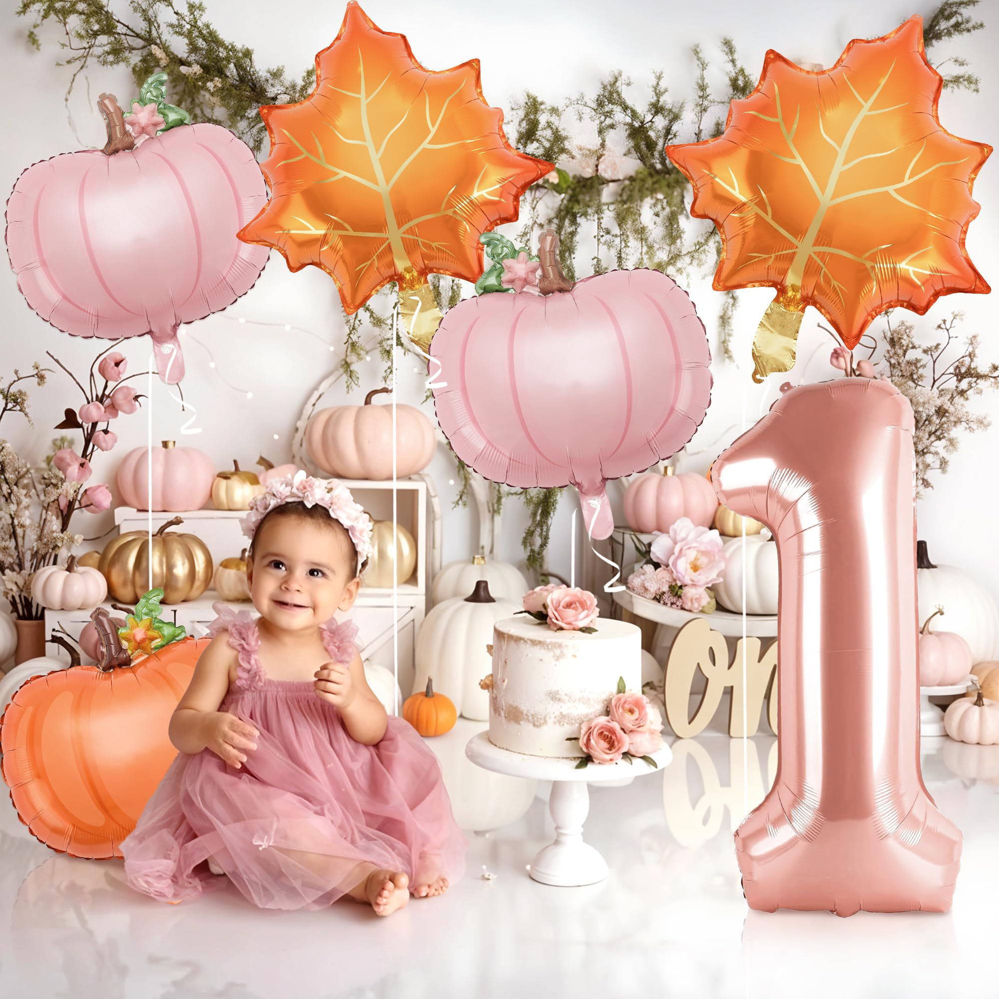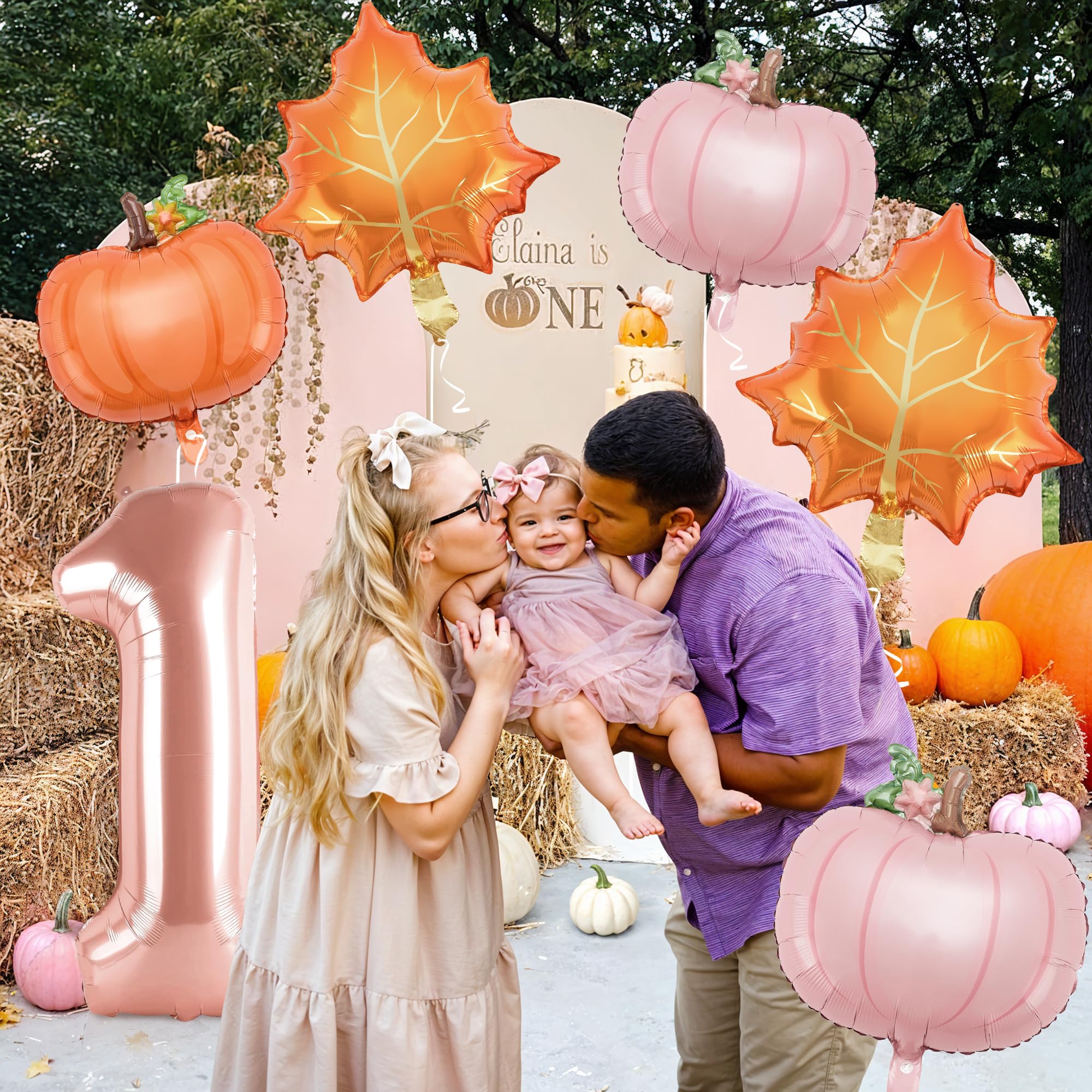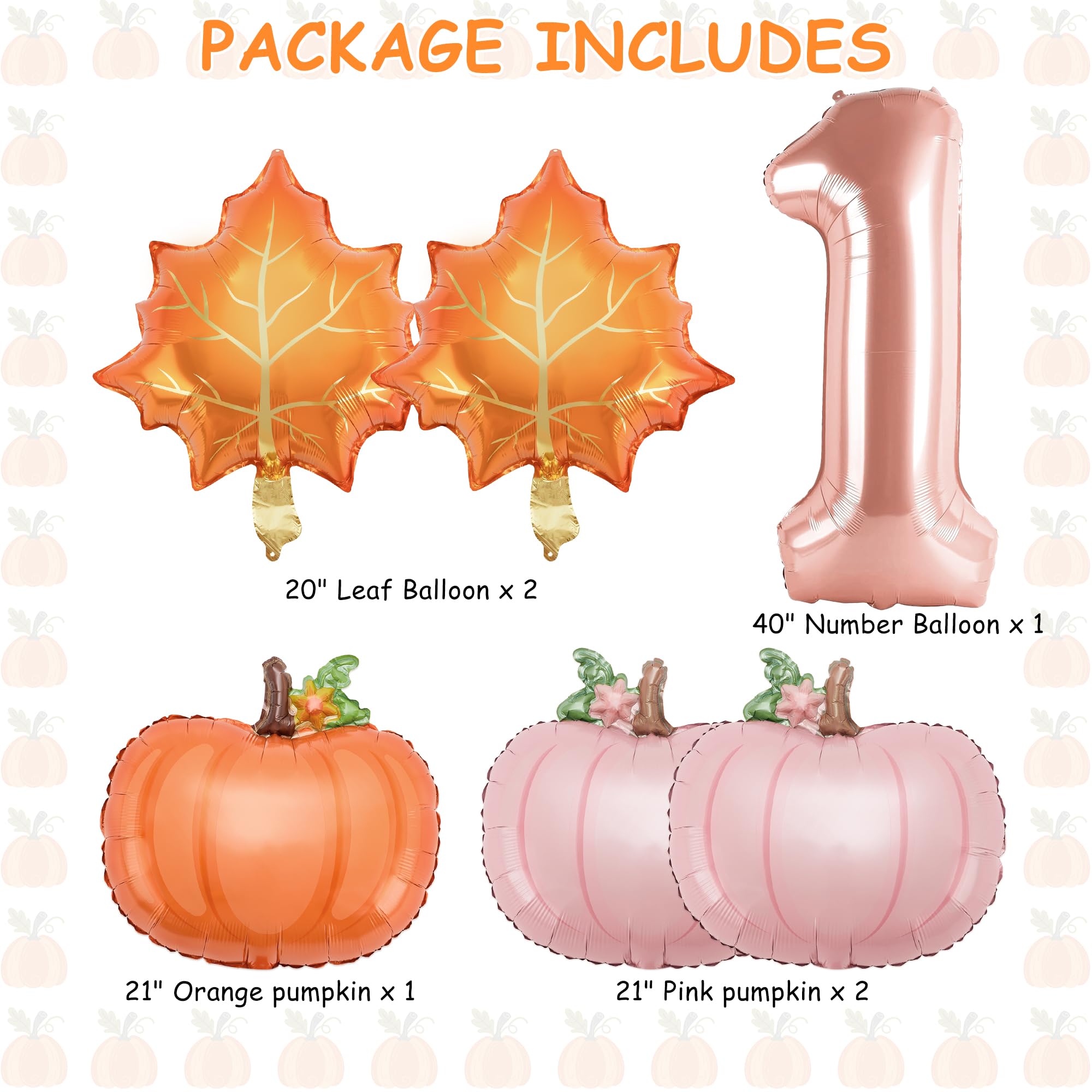 Complete Party Set – Includes 1× 40" rose gold number 1 balloon, 2× 21" pink pumpkin balloons, 1× 21" gray-orange pumpkin balloon, and 2× maple leaf balloons for a full, picture-perfect setup.