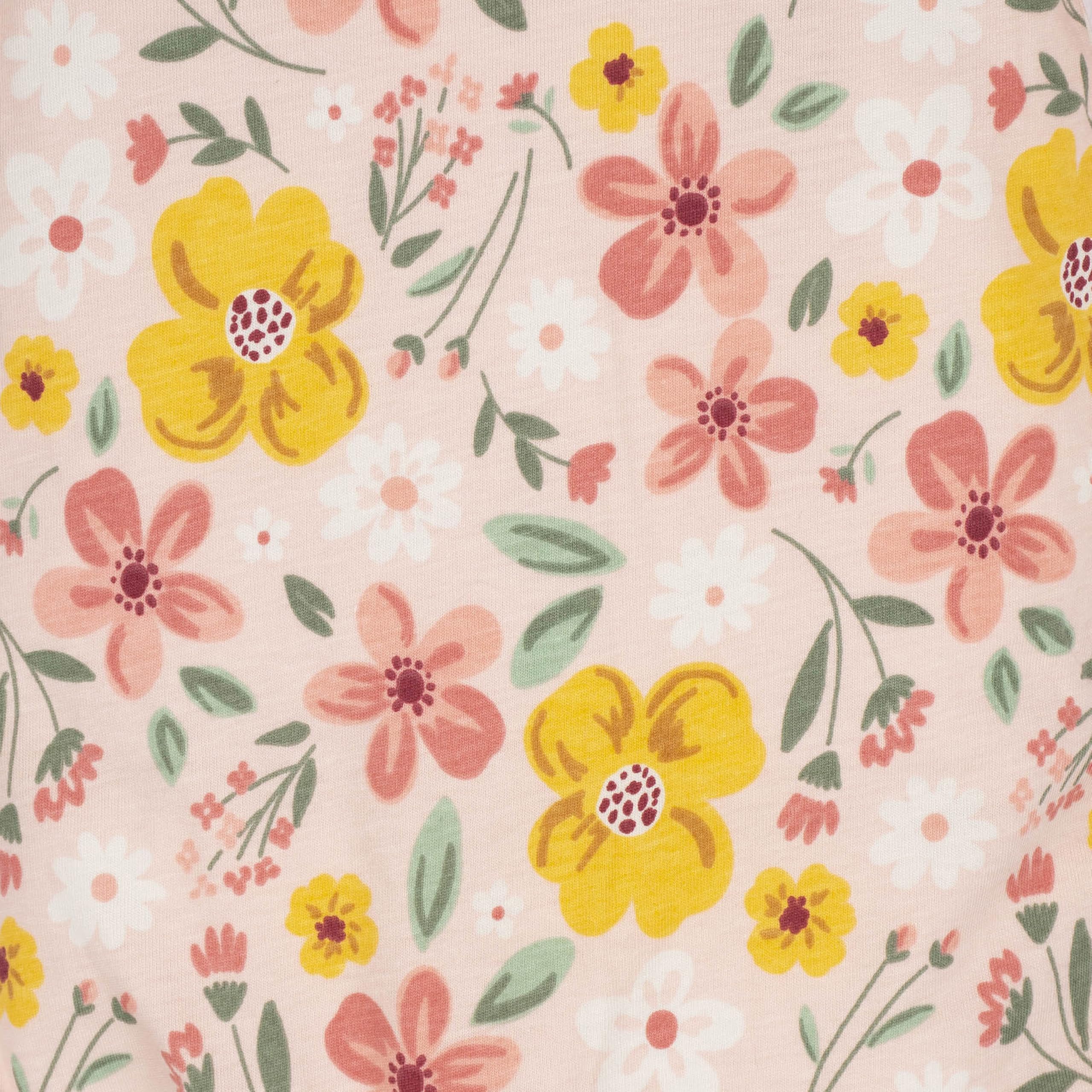 Yellow/ivory/pink/green with screen print, puff print floral art