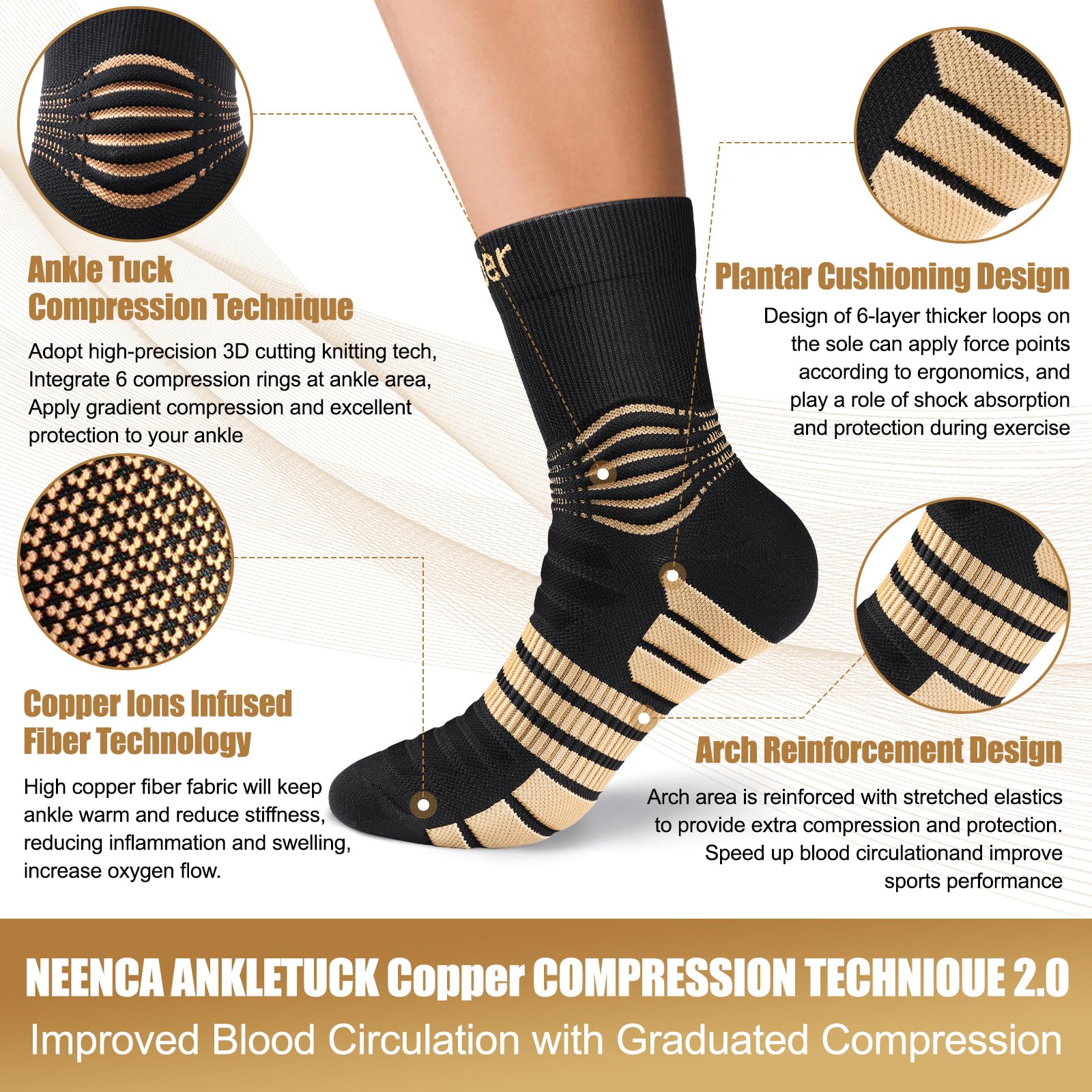 TARGETED RELIEF & SUPPORTā Benefit the advantage of 3D structure of woven and high-precision cutting technology of knitting, NEENCA got a well balance between compression and comfort. Copper compression socks will improves circulation around ankle-foot area, significantly effective reduce the pressure of joint and help the injuries to recover. Ergonomic design: 360° perfectly fit your foot and ankle curve, which will effectively disperses pressure, keeping your feet warm, lubricating joints.