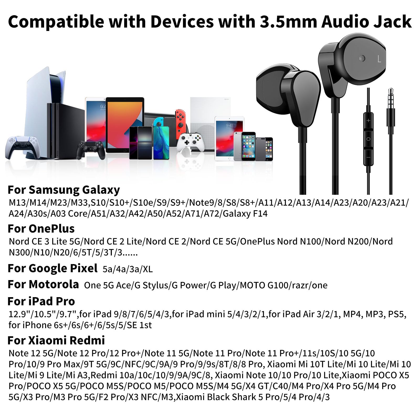 Wide Compatibility - Wired Earbuds with 3.5mm jack for Motorola G Stylus/Power/Play,for Samsung Galaxy A25/A15/S10/S10e/S9/S8/A14/A13/A23/A21/A30s/A03 Core/A52,Note 9/note 8,A42/A32/A71/A51/A21/A11/A50/A20, for Google Pixel 5a/4a/3a/XL,for OnePlus Nord/N300/N200/6/5T,for iPhone 6s/6/iPod,for iPad Pro 12.9"/10.5"/9.7",for iPad 9/8/7,for iPad mini 5/4,for iPad Air 3/2,for Android phone/tablets/PC/Laptop/Computer/Chromebook/Windows devices,for Switch/MP4/MP3 and other devices with 3.5mm audio jack