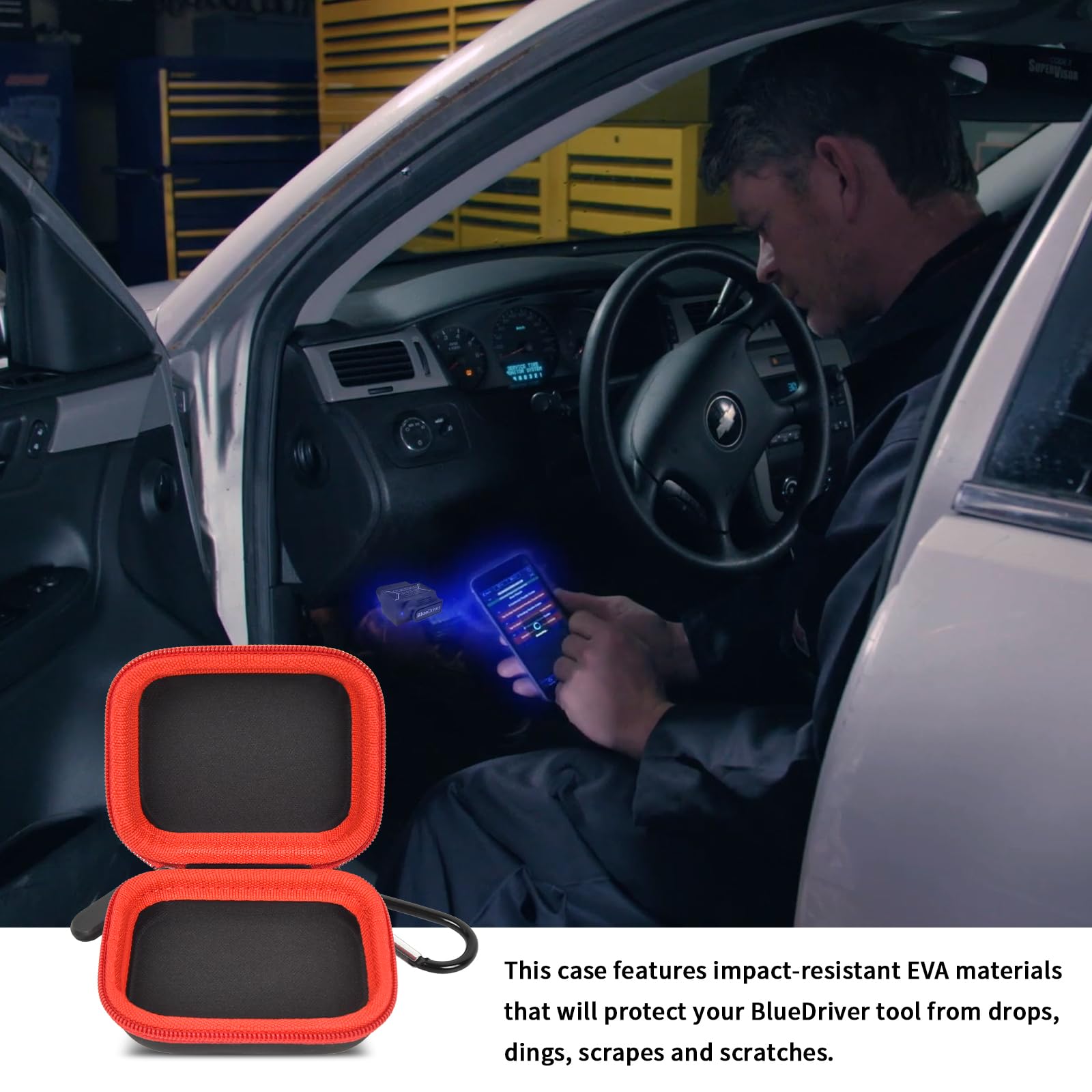 100% safe car scanner reader case holder: The Blue Driver OBDII scanner fits snugly in this case, without any looseness inside, keep your obd2 scanner safety all the time, this scanner tool case is sturdy, easy to open and close. You don't have to worry about damaging the OBD2 Diagnostic Scan Tool 'when' I accidentally drop the case or knock it to the ground.