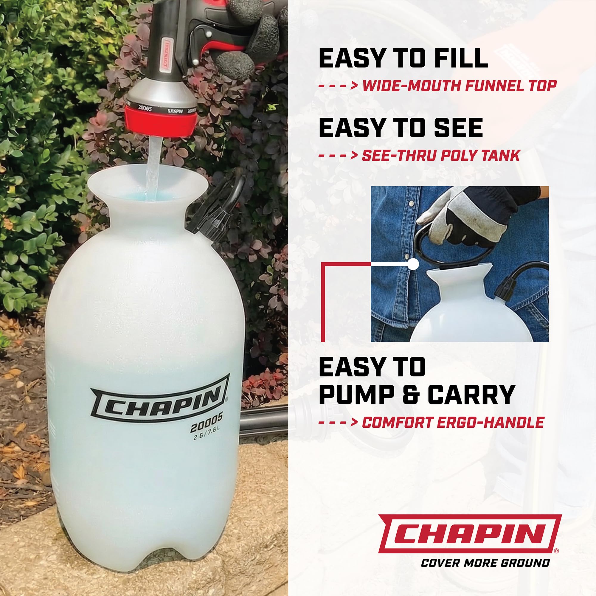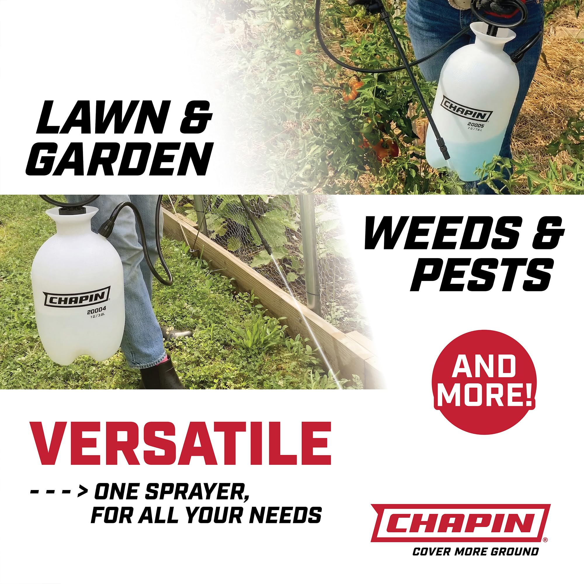 Product Description Easily tackle weeds, spray fertilizers, fight pests or water your hanging plants. Chapin’s 20004 1-gallon lawn and garden pump pressured sprayer is ideal for simple tasks inside and outside your home. The 1-gallon lightweight, rust-free polyethylene tank is translucent so it's easy to check fluid levels and the ergonomic pump handle makes carrying and pumping easy. Its funnel top design helps limit splashing while you’re filling the tank. Use this sprayer with common lawn, garden and pest control chemicals. Made in the USA with global materials and backed by Chapin’s 1-year limited warranty. The lightweight, rust-free polyethylene tank is translucent for easy fluid level checks, and the ergonomic pump handle provides comfortable carrying and pumping. The funnel-top design minimizes spills during filling. Compatible with common lawn, garden, and pest control chemicals, it’s Made in the USA with global materials and backed by Chapin’s 1-year limited warranty. From the Manufacturer: Our residential, professional and industrial sprayers are designed to meet the needs of your lawn, garden, home, farm, professional, or commercial project. With a focus on innovation gained through industry knowledge, Chapin products have been manufactured with excellence in the United States using global components for more than 130 years. We offer full technical support at 800-950-4458 to help you find the right sprayer for your application or visit our website at chapinmfg.com for more product information and specifications. Chapin, the way to spray since 1884. Amazon.com The Chapin 1-gallon lawn and garden poly sprayer is ideal for fertilizers, weed killers and pesticides. Built with the Clean 'N Easy design, this sprayer features the patented Sure Spray filter to help prevent clogging. The translucent 1-gallon bottle allows for easy monitoring of fluid levels and has a large, funnel top opening for no mess in mixing and cleaning. This sprayer is equipped with an adjustable nozzle an auto/manual high pressure relief valve, and a straight wand. From the Manufacturer Our residential, professional and industrial sprayers are designed to meet the needs of your lawn, garden, home, farm, professional, or commercial project. With a focus on innovation gained through industry knowledge, Chapin products have been manufactured with excellence in the United States using global components for more than 130 years. We offer full technical support at 800-950-4458 to help you find the right sprayer for your application or visit our website at chapinmfg.com for more product information and specifications. Chapin, the way to spray since 1884.