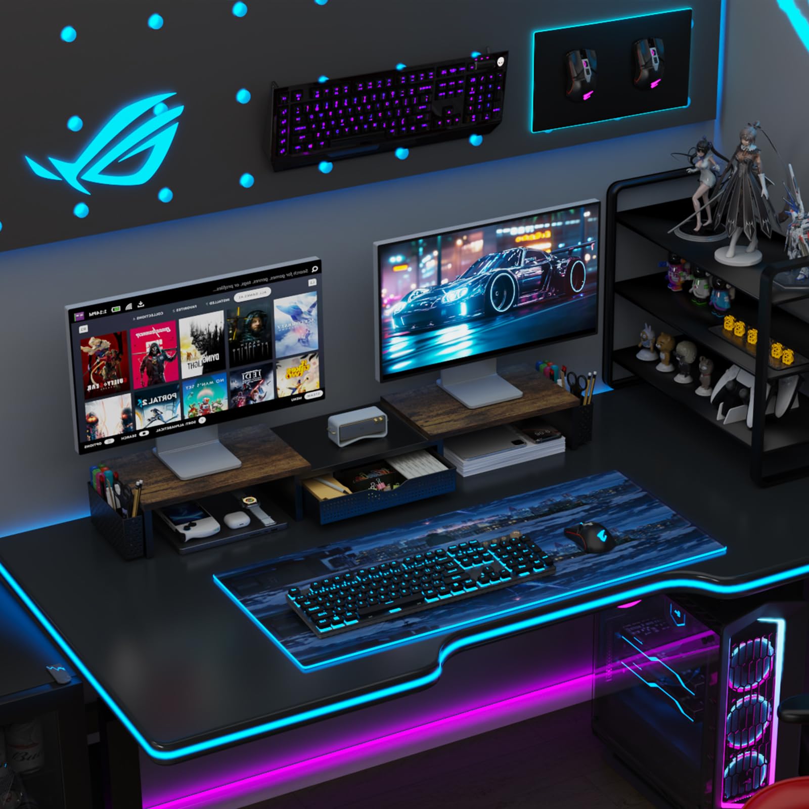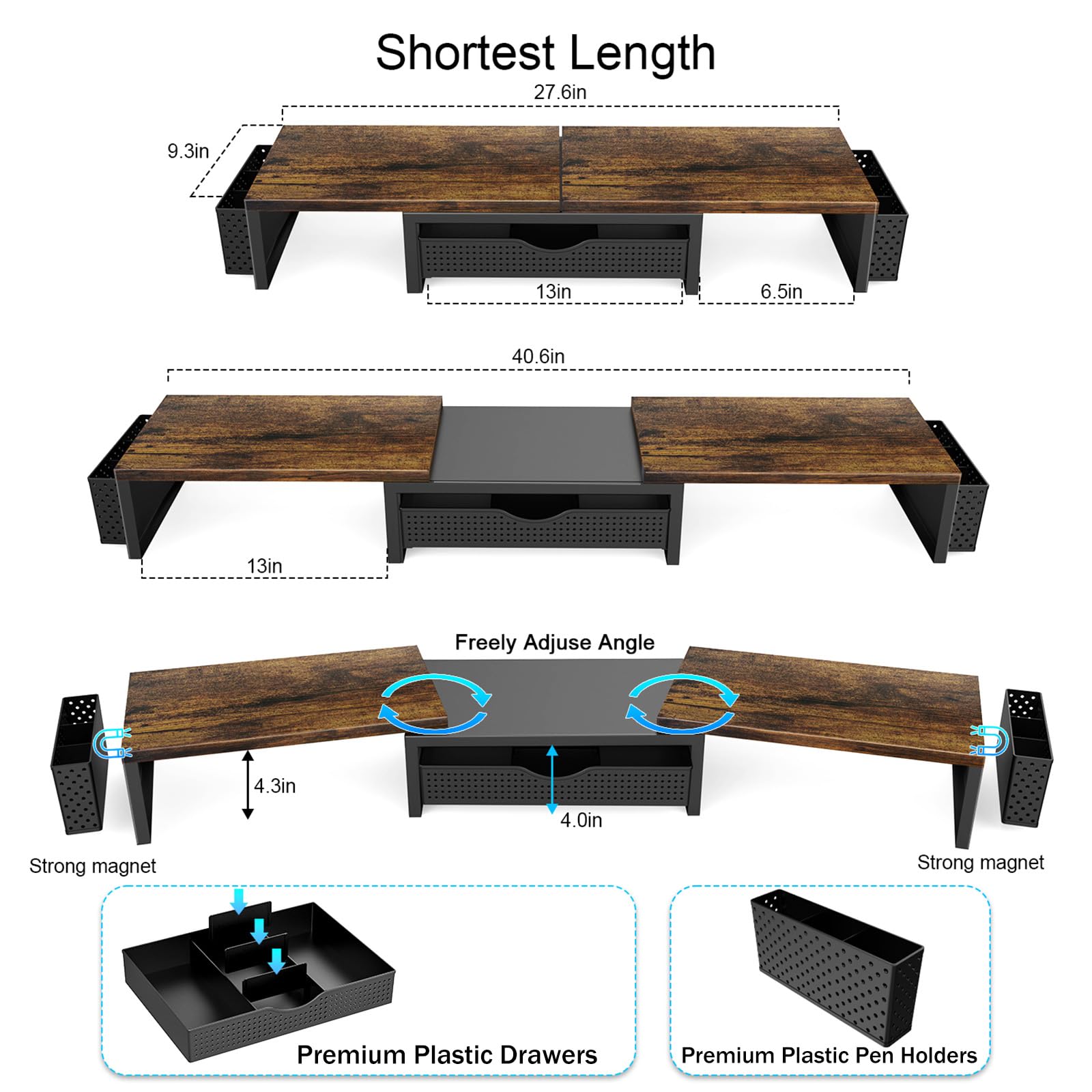 【Ample Storage Space】The dual monitor stand features two magnetic pen holders and a drawer, allowing you to easily organize your desk accessories and office supplies, keeping your workspace clear and tidy for easier access.
