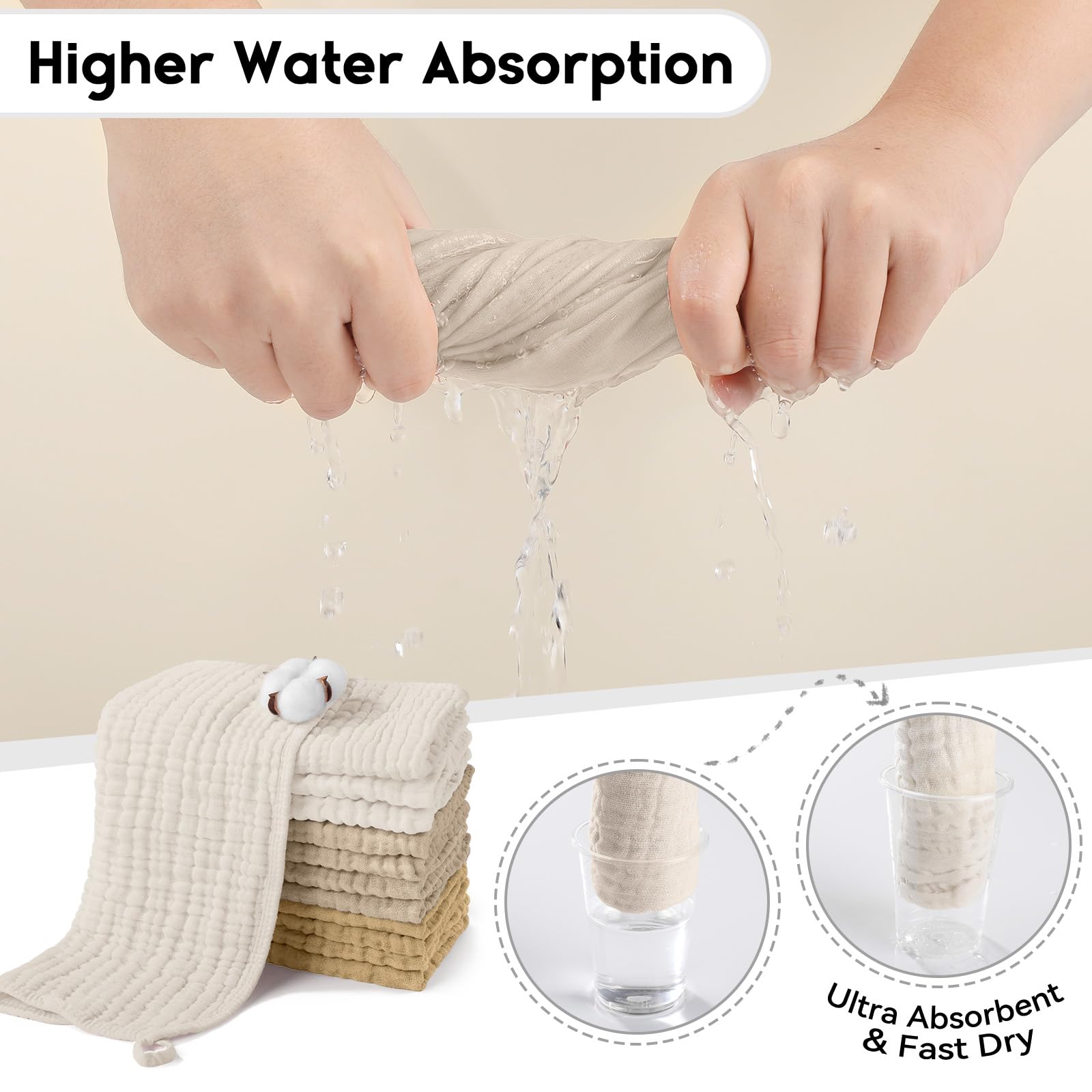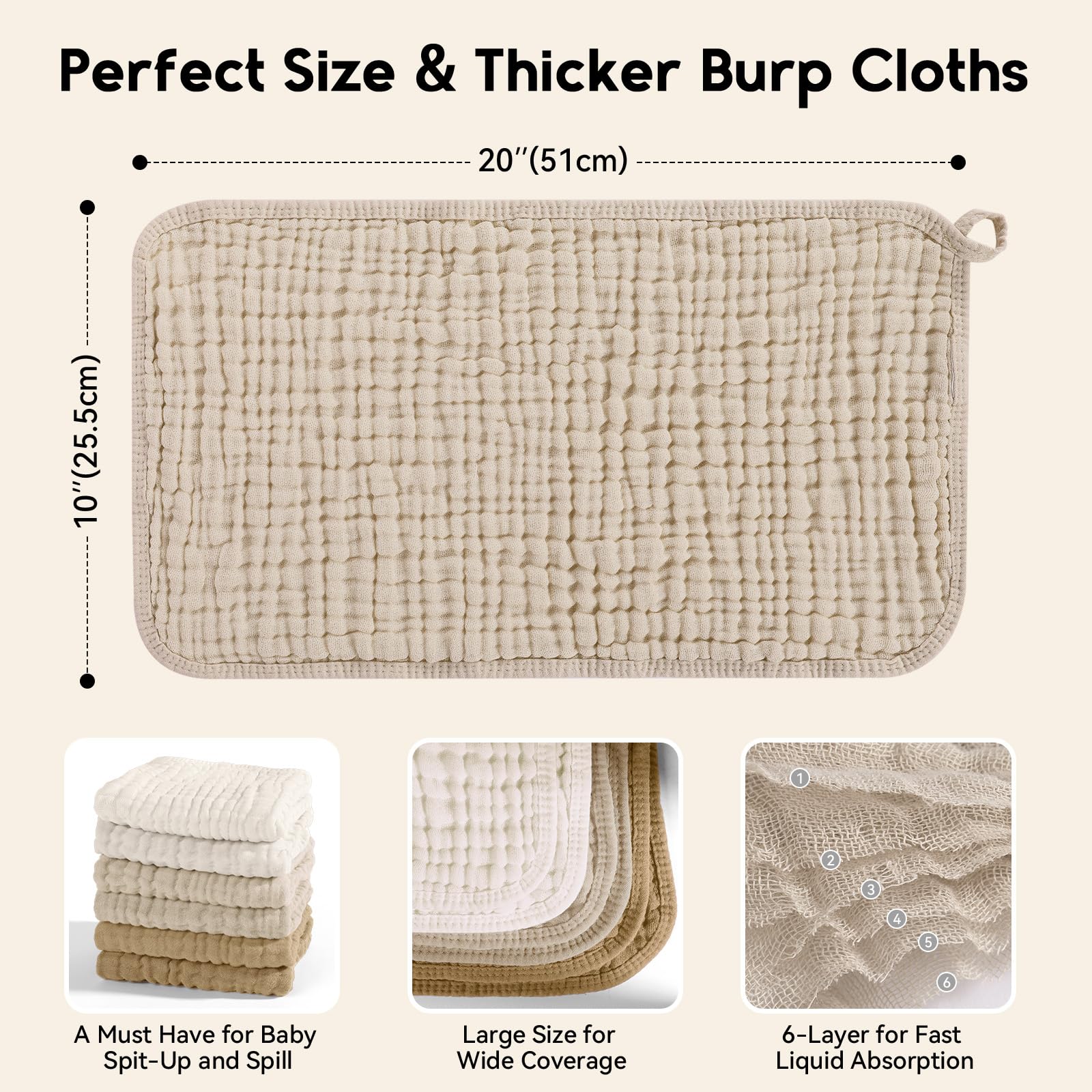 Excellent Absorbent: Featuring 6 layers of absorbent muslin and fluffy structure design, our burping cloths for babies provide maximum absorption with tendor touch, works well to protect your teething baby from all dribble and spit ups soaking their clothes. Large 20''X10'' size provides maximum coverage and extra layering adds durability, making them ideal for use in any season.