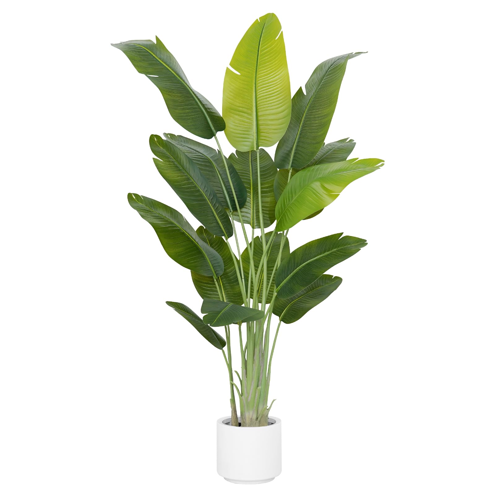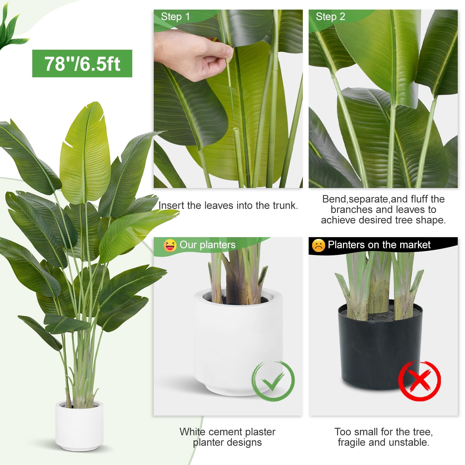 ๐๐ข๐ฆ๐๐ง๐ฌ๐ข๐จ๐ง๐ฌ & ๐๐ฎ๐๐ง๐ญ๐ข๐ญ๐ฒ: The artificial Birds of Paradise plant artificial tree stands nearly 78 inches tall, with a natural height of 78 inches after spreading the branches and leaves. The white container has a diameter of 7.87 inches and a height of 7.87 inches. It features 15 large banana leaves. Tips: 1. Spread the branches and leaves to achieve the fullest shape and optimal natural height. 2. The flower planter and dry moss shown in the pictures are not included in the product package. This large fake plant is ideal as a floor plant or a big tree to enhance your home decor