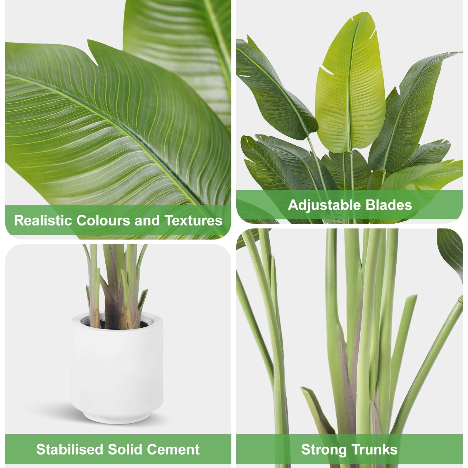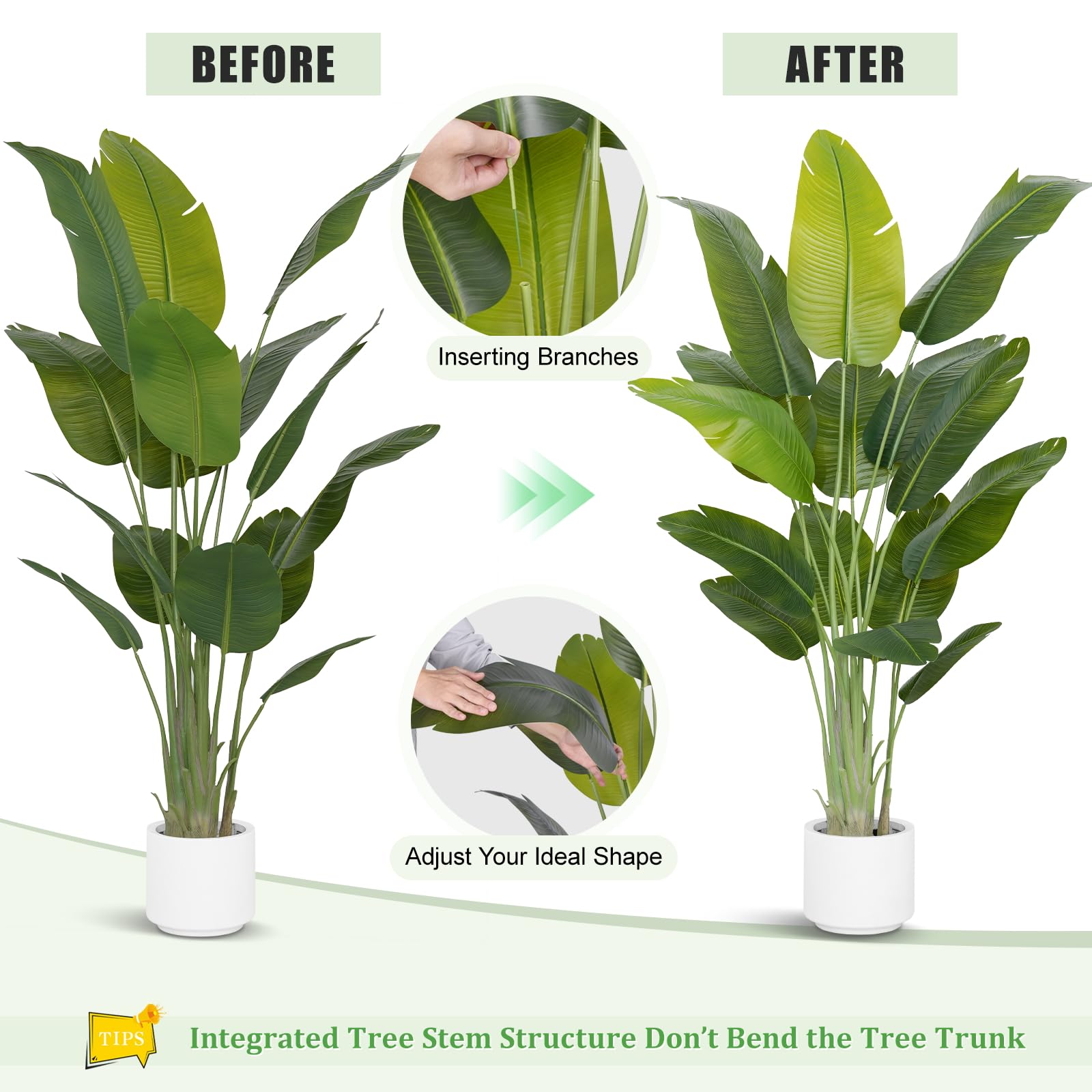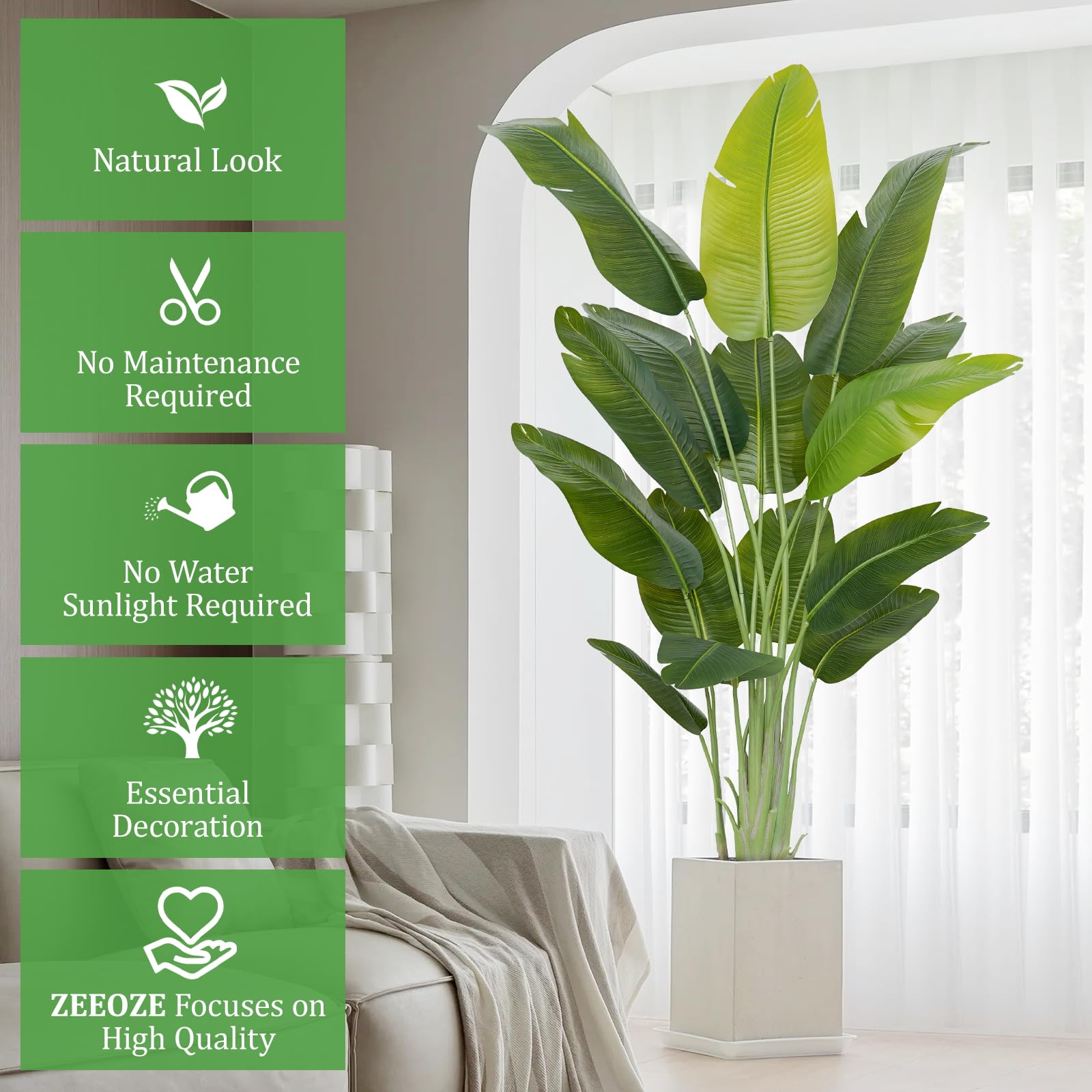 ๐๐ข๐๐๐ฅ๐ข๐ค๐ ๐๐๐ญ๐๐ข๐ฅ๐ฌ: The ZEEOZE faux Birds of Paradise plant artificial tree features realistic trunks, adjustable branches, and natural-textured banana leaves. Sturdy polyester trunks ensure long-term durability, while detachable leaves with distinct colors wonโt fade over time. The adjustable branches contain iron wire for flexible positioning. Newly upgraded white planters, adorned with black wood shavings on the surface, are filled with sturdy cement to keep the big tree upright and prevent tipping. This fake tree is a perfect example of a high-quality artificial tree